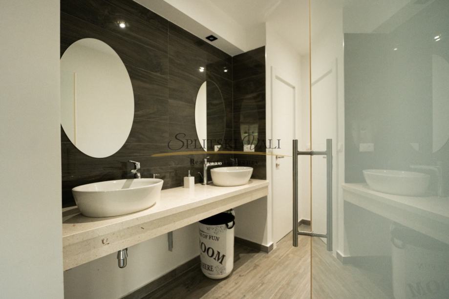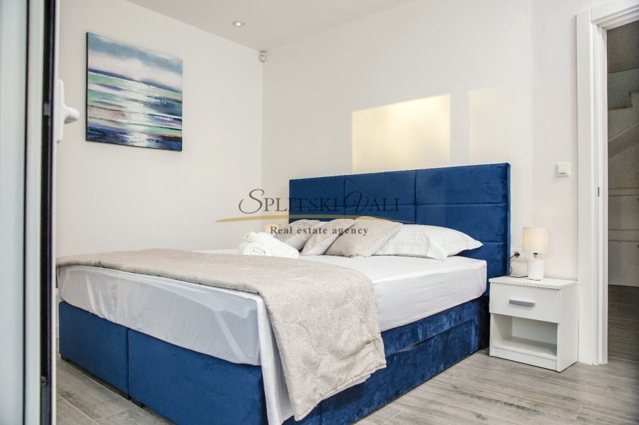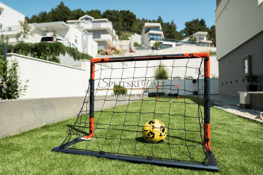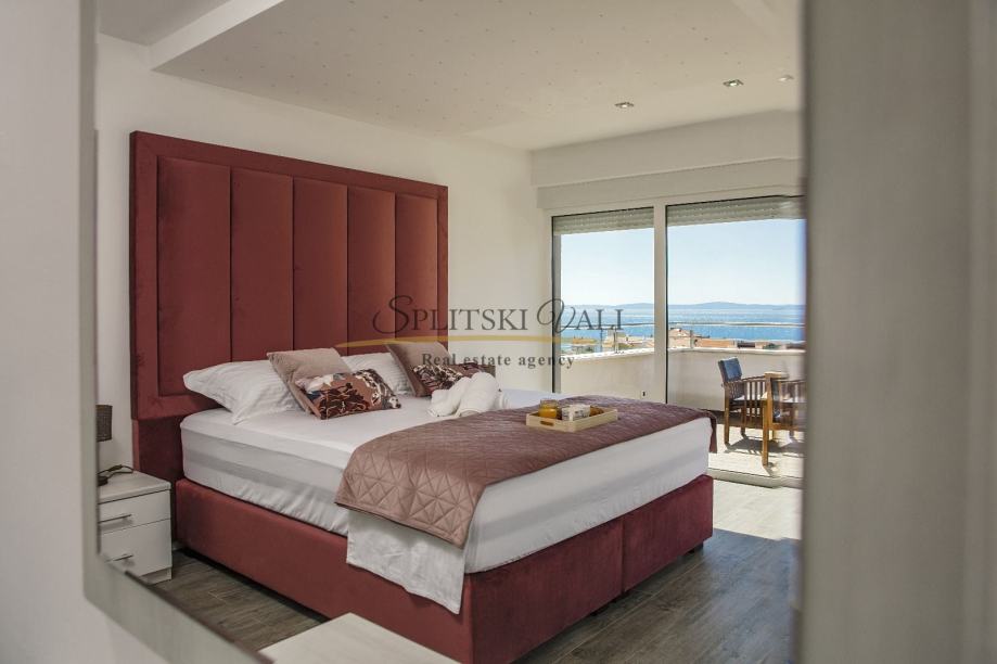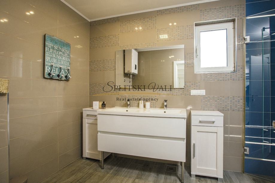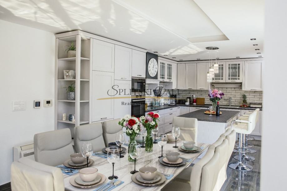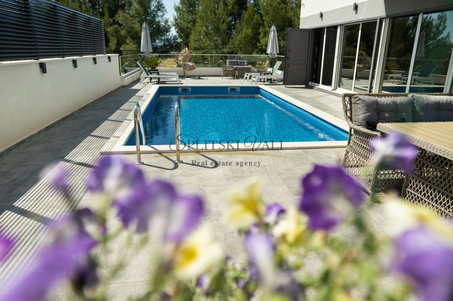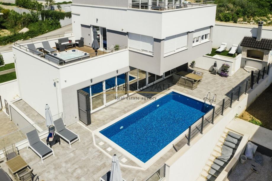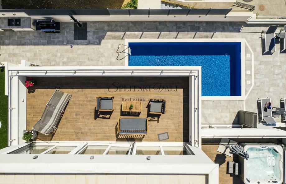 Iz dnevnog boravka se izlazi na prostranu terasu s bazenom i roštiljem. Na prvom katu se nalaze 3 spavaće sobe, kupaonica i velika teresa s Jacuzzijem. Na zadnjoj etaži se nalazi master spavaća soba s vlastitom kupaonicom i velikom terasom s koje se pruža lijepi pogled na more.