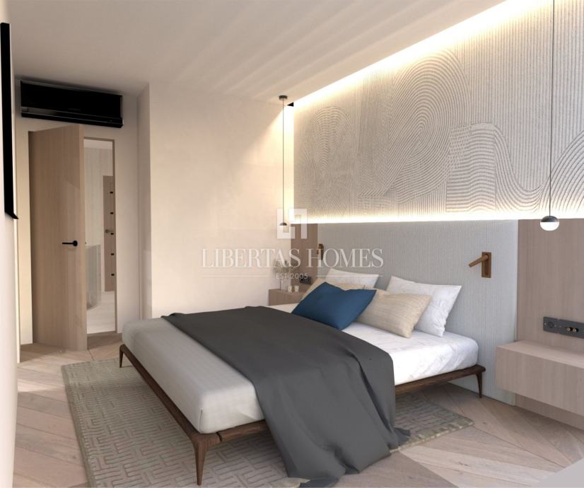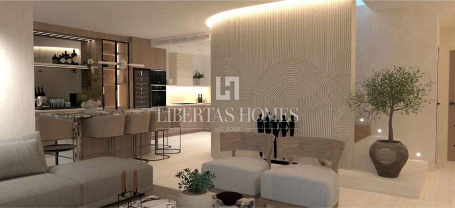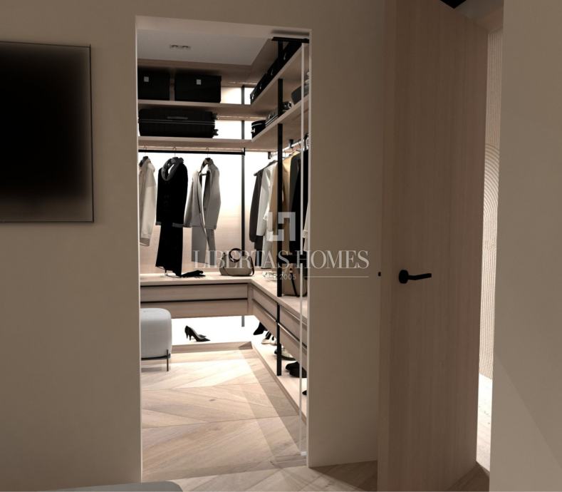 Kuhinja po mjeri, od svijetlog hrastovog furnira, opremljena je vrhunskim uređajima brendova Samsung, Liebherr i Miele. Centralni kuhinjski otok kombinira hrastov furnir i radnu plohu od bijelog kvarca Calacatta debljine 3 cm. U interijeru se ističe i tailor-made zidni bar s integriranom rasvjetom, toniranim ogledalom i kvarcnim policama. Namještaj dolazi iz kolekcija renomiranih brendova poput Calligaris, Ditre Italia i LeComfort, dok su kupaonice opremljene armaturama Hansgrohe u završnoj obradi brušene bronce.