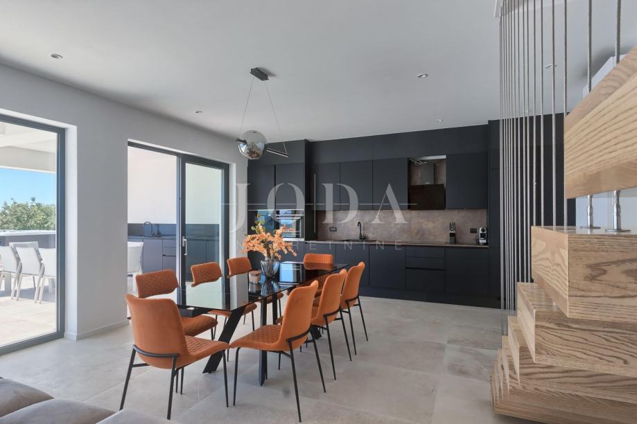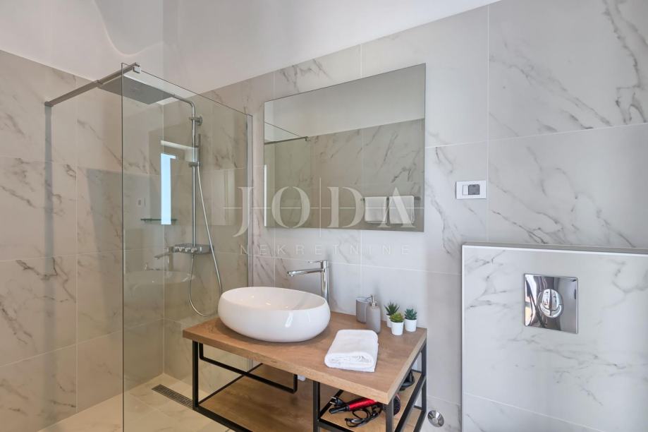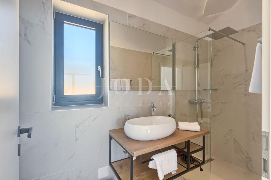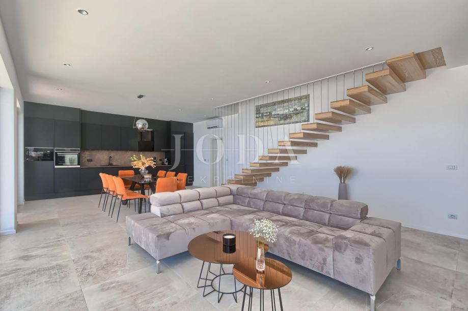 Prodajemo luksuznu vilu sa zapanjujućim pogledom na more i Kvarner. Vila je smještena na istočnoj obali Istre u blizini Rapca i Labina. Vila ima 4 spavaće sobe sa kupaonicama, veliki dnevni boravak, kuhinju sa blagovaonicom, prostorijom za fitness te saunu. Sve prostorije imaju velike staklene stijene pa se pogled na more pruža iz svih prostorija. Opremljena je podnim grijanjem te su sve prostorije klimatizirane. Ispred vile nalaze se bazen i jacuzzi sa sunčalištem a pored vanjska natkrivena kuhinja sa prostorom za druženje i uživanje u panoramskom pogledu. Vila se prodaje potpuno namještena i spremna za korištenje.