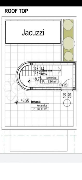 Na prvom katu su 3 spavaće sobe, kupaonica i terasa. Na drugom katu nalaze se 2 spavaće sobe , 2 kupaonice i 2 terase. Na krovnoj terasi sa prekrasnim pogledom na more i otoke nalazi se bazen i Spa.