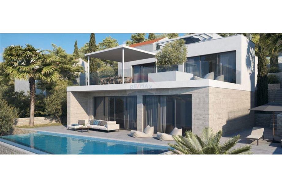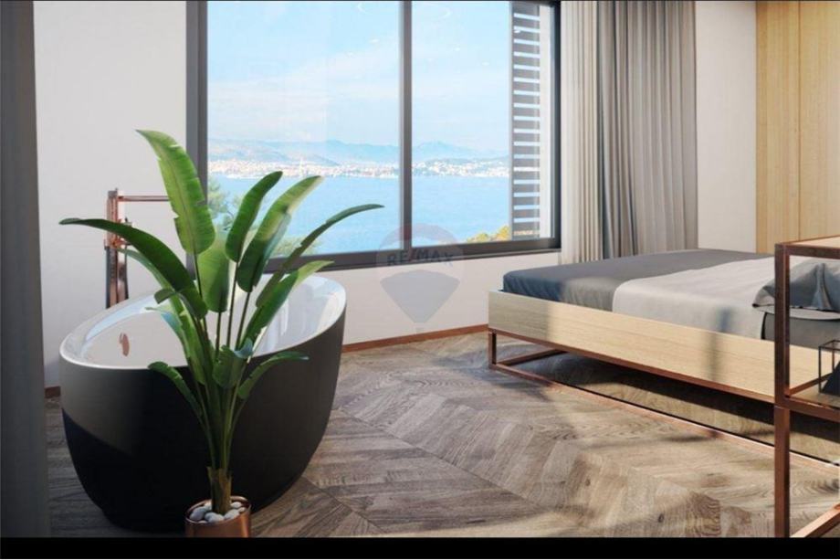 Sobe su klimatizirane, dnevni boravak izlazi na terasu s, bazenom, koja ima panorama pogled na more. Na toj etaži se nalazi i pomoćna prostorija površine 2,5 m2, svlačionica površine 3,25 m2, kupaonica površine 4,81 m2 i jedna garaža sa dva parking mjesta.