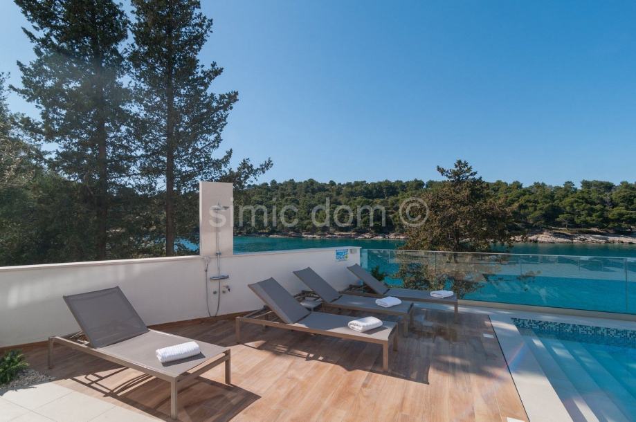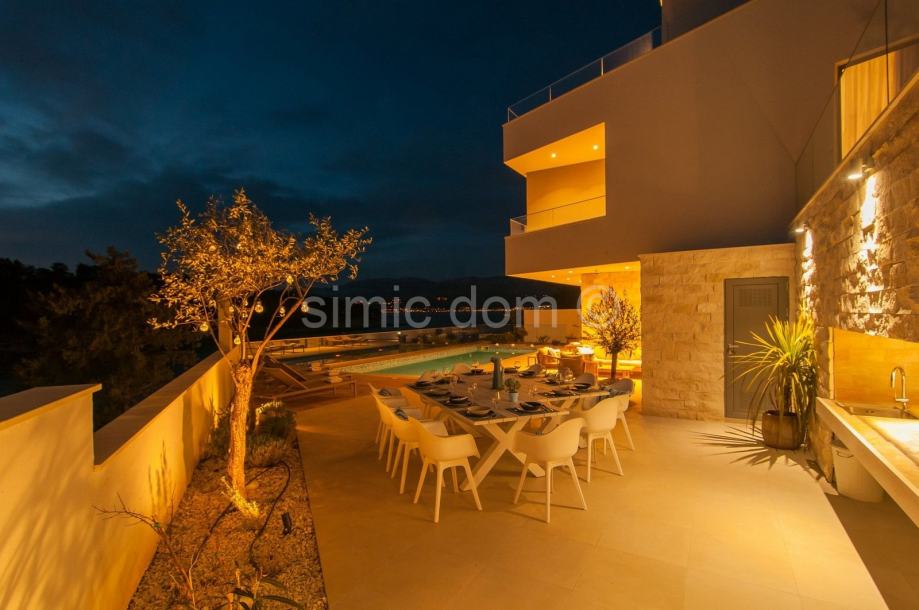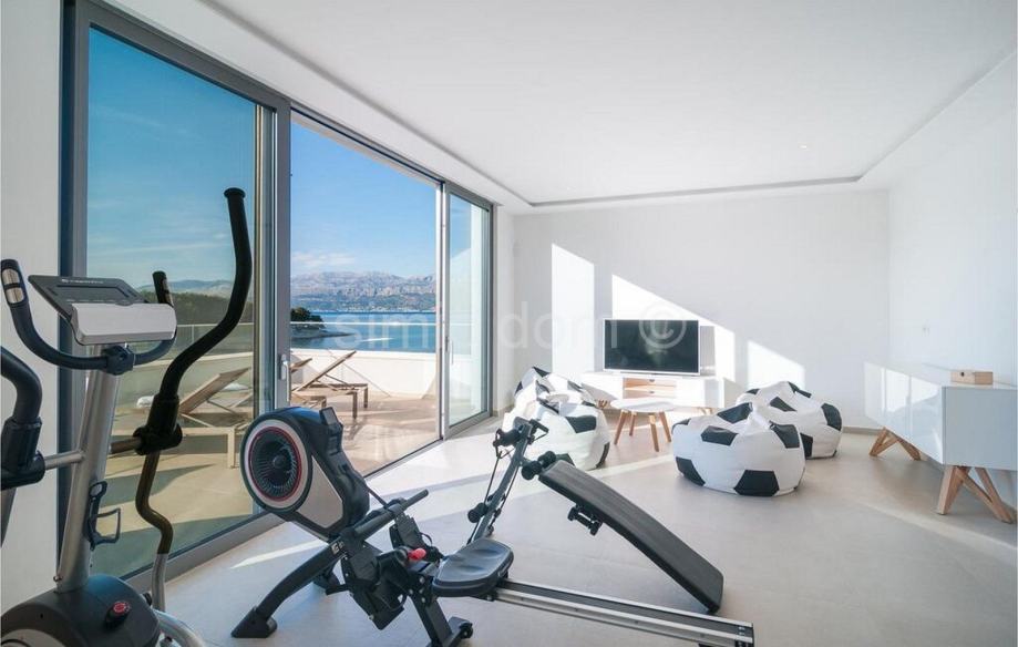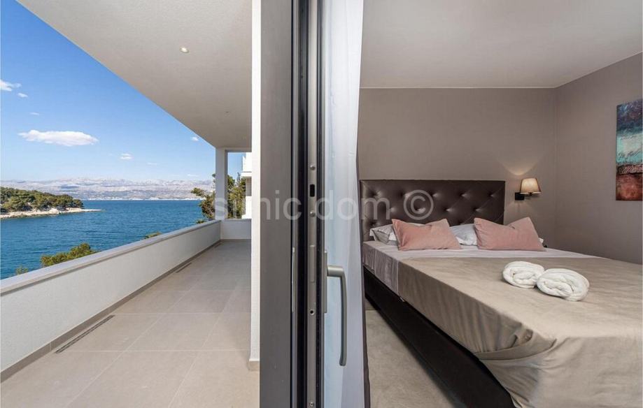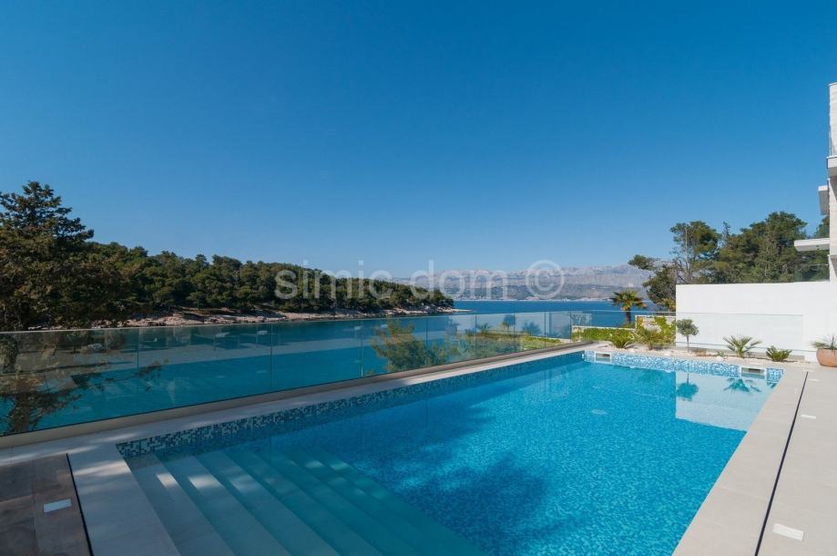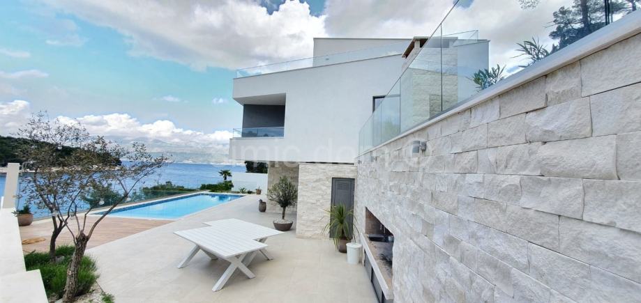 Posredujemo u prodaji prekrasne, novoizgrađene vile na otoku Braču. Vila se nalazi u prvom redu do kristalno čistog mora. Ukupna joj je stambena površina 244m2, a sastoji se od prizemlja i dva kata. Prizemlje vile se sastoji od ulaza, dnevnog boravka, blagovaonice, kuhinje, stubišta, dodatnog toaleta, garderobe i tehničke sobe. Velike staklene stijene omogućuju mnoštvo dnevnog svjetla i dojam otvorenog prostora. Na ovoj je razini i velika terasa s bazenom i sunčalištem, a pruža se i prekrasan pogled na more i uvalu. Na prvom se katu nalazi hodnik s četiri spavaće sobe i pripadajućim kupaonicama. Drugi kat, pak, ima još dvije spavaće sobe s kupaonicama te prostor u kojem je sauna sa spravama za vježbanje. Vila je vrlo luksuzno opremljena i namještena (alarm, video nadzor, klimatizacijski uređaji, visokokvalitetna keramika i oprema za kupaonice, kućanski aparati renomiranog proizvođača), a dostupan je i parking za četiri automobila. Vlasništvo uredno.