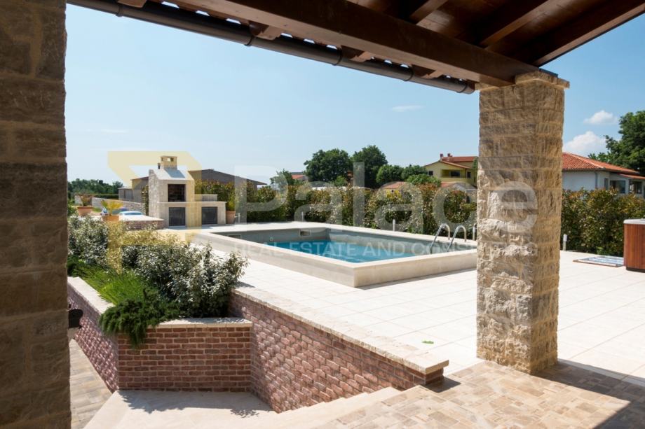 Vanjski prostor vile nudi sve što je potrebno za potpuni užitak na otvorenom. Tu je natkrivena terasa s udobnim namještajem, bazen veličine 24 m² i tušem, te vanjski jacuzzi za opuštanje uz poglede na prirodu. U vrtu se nalazi zidan roštilj, idealan za pripremu obroka na svježem zraku, dok je za ljubitelje kuhanja na otvorenom tu i roštilj na ugljen ili drvo. Vila također nudi prostrane zelene površine, savršene za obiteljske igre ili opuštanje.