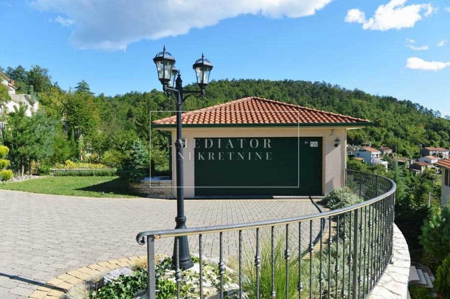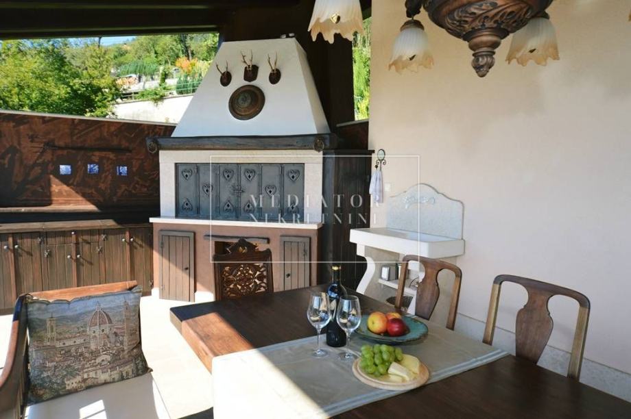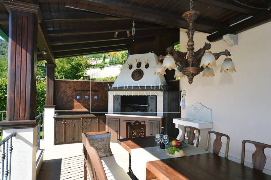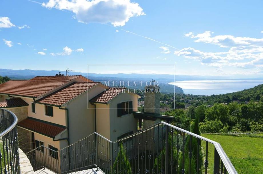 Unutarnji prostor krase bogati materijali poput hrastovih podova, dekorativnih drvenih greda i kvalitetnog namještaja. Prostrani dnevni boravak s panoramskim prozorima povezan je s elegantnom kuhinjom i blagovaonicom. Iz dnevnog boravka izlazi se na veliku terasu s prekrasnim pogledom na cijeli Kvarnerski zaljev, savršenu za objedovanje na otvorenom i opuštanje uz veliki kameni roštilj.