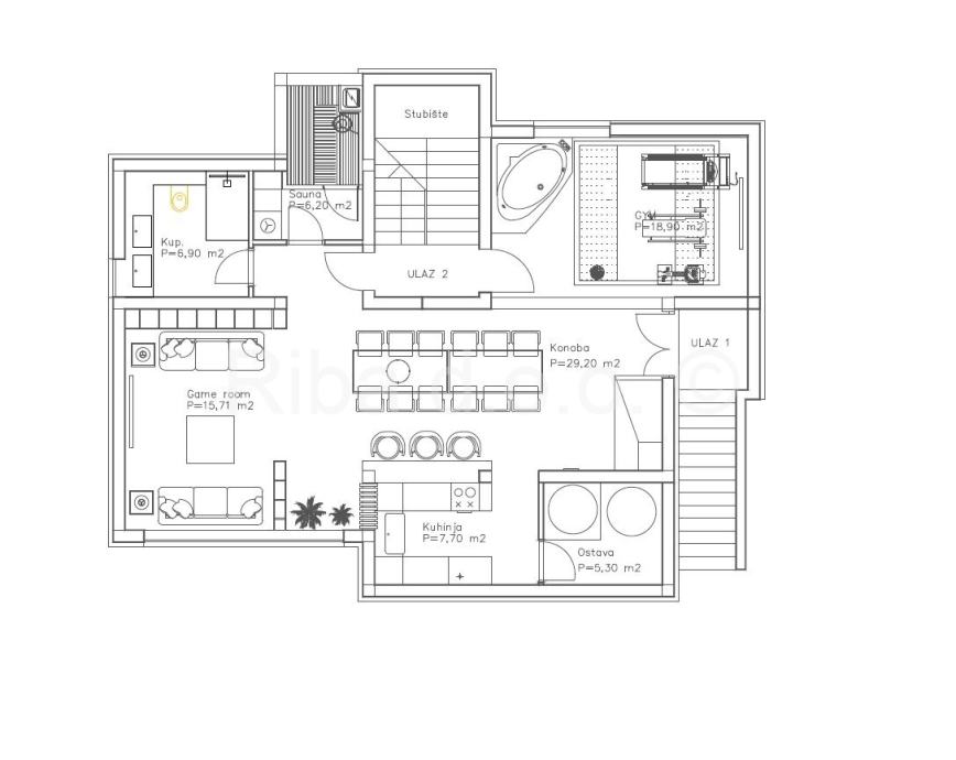 Raspored prostorija:Podrum:•konoba•teretana•kuhinja•dnevna soba•WC s kadomPrizemlje:•veliki dnevni boravak•kuhinja i blagovaonica•spavaća soba•dvije terase•WC i kupaonicaKat:•master spavaća soba s vlastitim WC-om i garderobom•dvije prostrane spavaće sobe s izlazom na terasu•zajednička kupaonica s WC-om•velika terasaDodatne pogodnosti:•bazen dimenzija 12 x 3,5 m•podno grijanje u cijeloj kući•klima uređaji za grijanje i hlađenje•dva kamina•vrhunska izolacija i kvaliteta gradnje