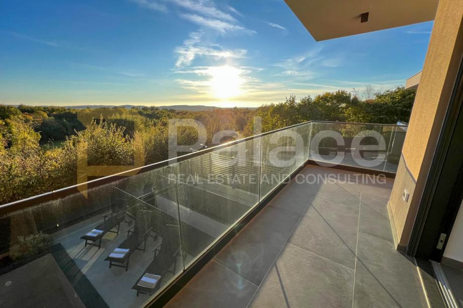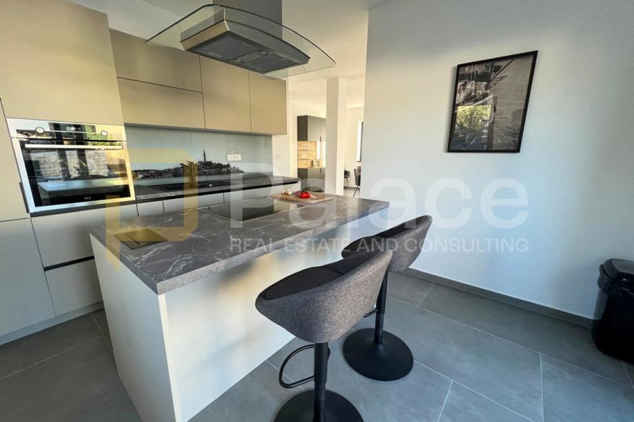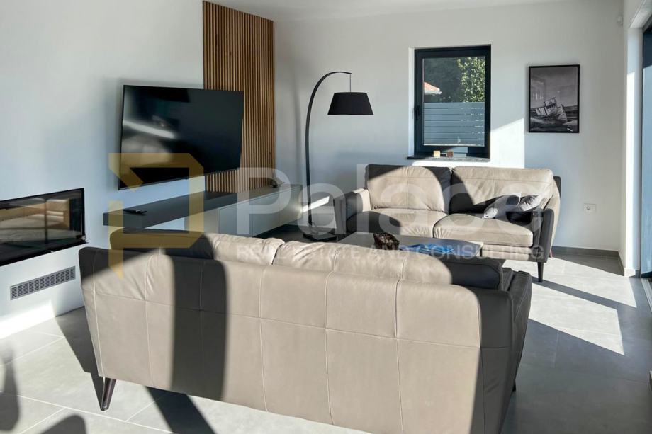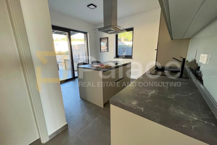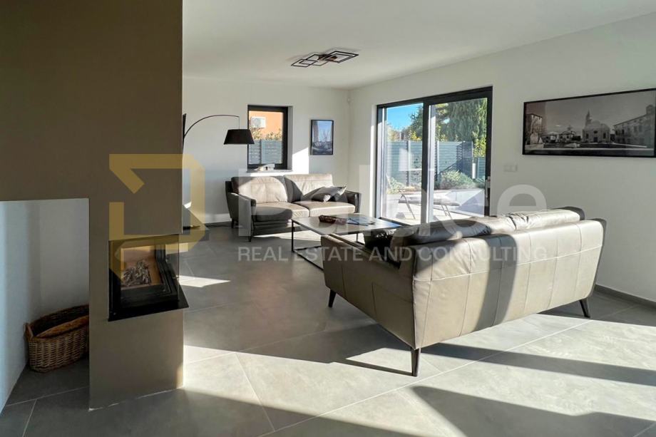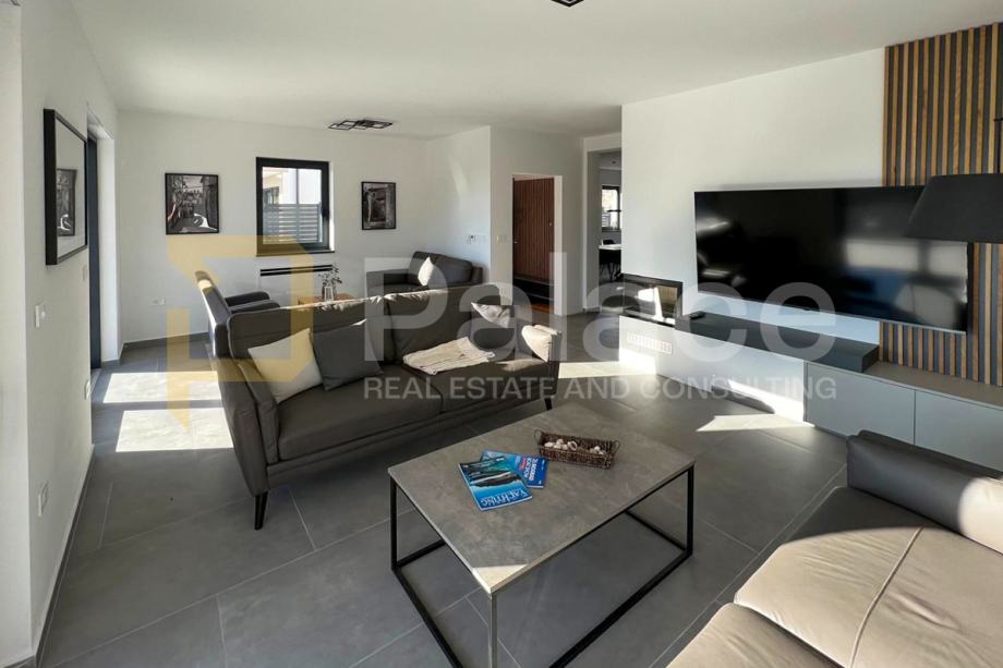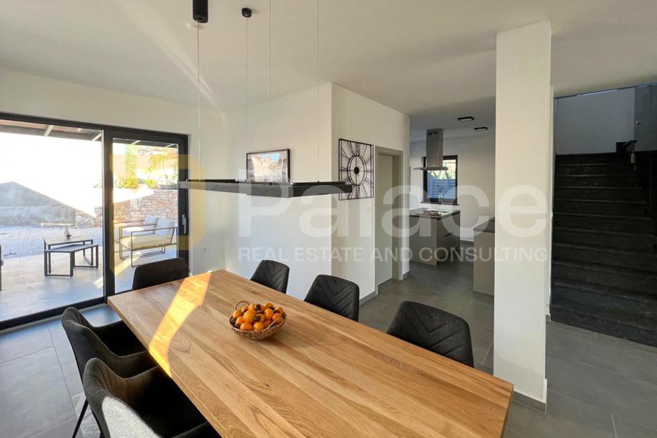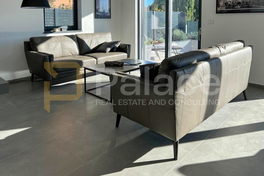 Prizemlje je otvoreno, prozračno i funkcionalno, s prostranim dnevnim boravkom, blagovaonicom i potpuno opremljenom kuhinjom, idealnim za obiteljska okupljanja i društvena događanja. Grijanje je riješeno pomoću podizača topline, a u cijeloj kući nalazi se podno grijanje i hlađenje s ventilkonvektorima, osiguravajući optimalnu temperaturu tijekom cijele godine. Također, tu je i tehnička soba koja omogućava optimalno upravljanje svim kućnim sustavima. Svi prozori i vrata opremljeni su ALU K troslojnom stolarijom koja osigurava visoku energetsku učinkovitost i zvučnu izolaciju, čineći vilu energetski učinkovitom i ugodnom za život.