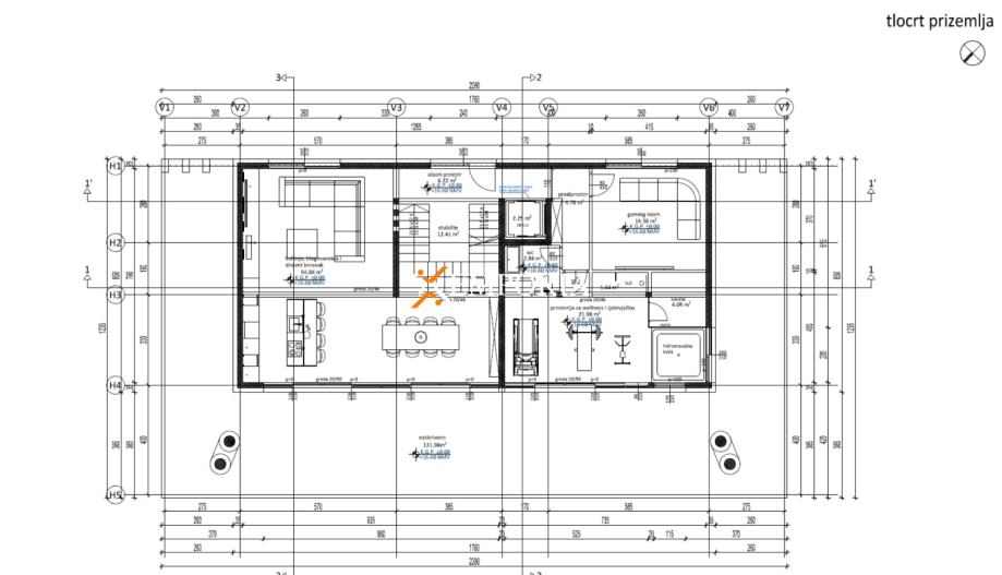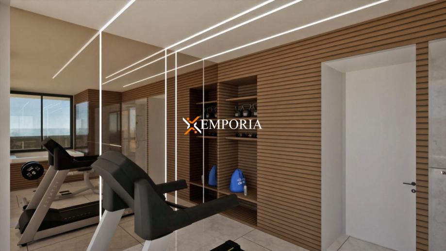 Prizemlje (256,82 m²) – prostrani ulazni prostor, elegantno stubište, moderna kuhinja s blagovaonicom i dnevnim boravkom, predprostor, gaming room, wellness s jacuzzijem, sauna, teretana, tuš i WC te natkrivena terasa za opuštanje.