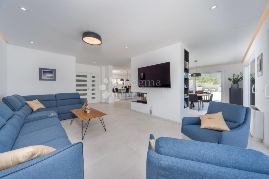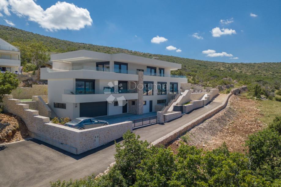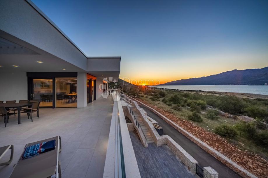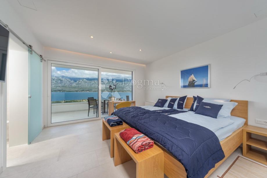Glavna stambena razina na prvom katu obuhvaća prostranu kuhinju s blagovaonicom, dnevni boravak, WC za goste te tri spavaće sobe, svaka s vlastitim kupatilom. Na drugom katu nalazi se dodatna jedinica s potpuno opremljenom kuhinjom, blagovaonicom, dnevnim boravkom, WC-om za goste i dvije spavaće sobe s vlastitim kupatilima – idealno za goste ili privatne zone. Sve prostorije pružaju nezaboravan pogled na more i impresivan pejzaž Velebita.