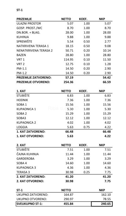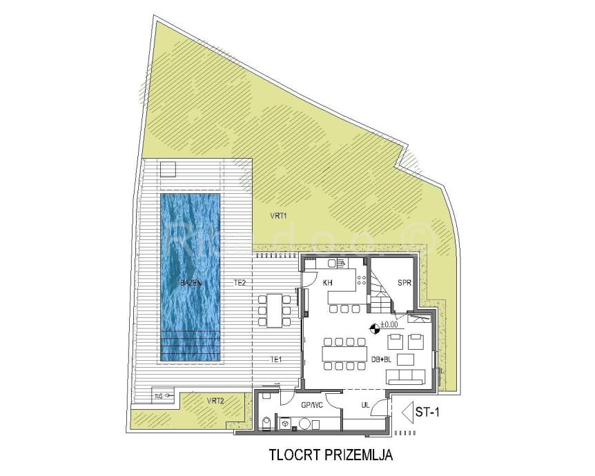 U prizemlju je dnevni boravak, kuhinja, blagovaonica, spremište, toalet, velika natkrivena i nenatkrivena terasa, izlaz u vrt i na bazen.