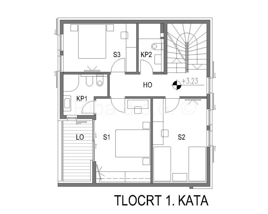 Na prvom katu su tri spavaće sobe i dvije kupaonice, te lođa.