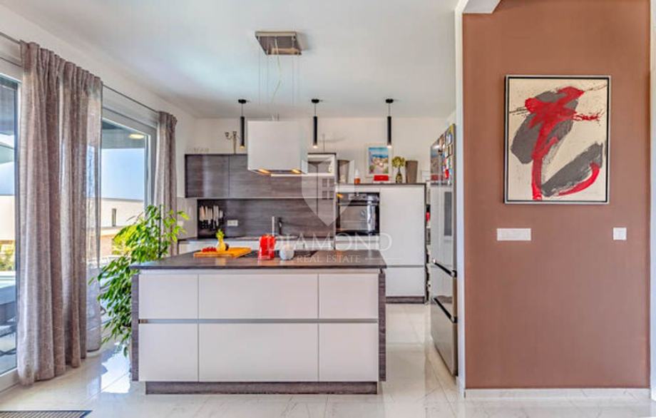 Kuća se sastoji od 3 etaže. U prizemlju se nalazi veliki otvoreni prostor pun svjetlosti i prekrasnim pogledom na more. Sastoji se od kuhinje sa dnevnim boravkom i blagovaonicom sa izlazom prema endless bazenu. Na katu kuće nalazi se 4 spavaće sobe svaka sa svojom kupaonicom te velika terasa sa očaravajućim pogledom na more.