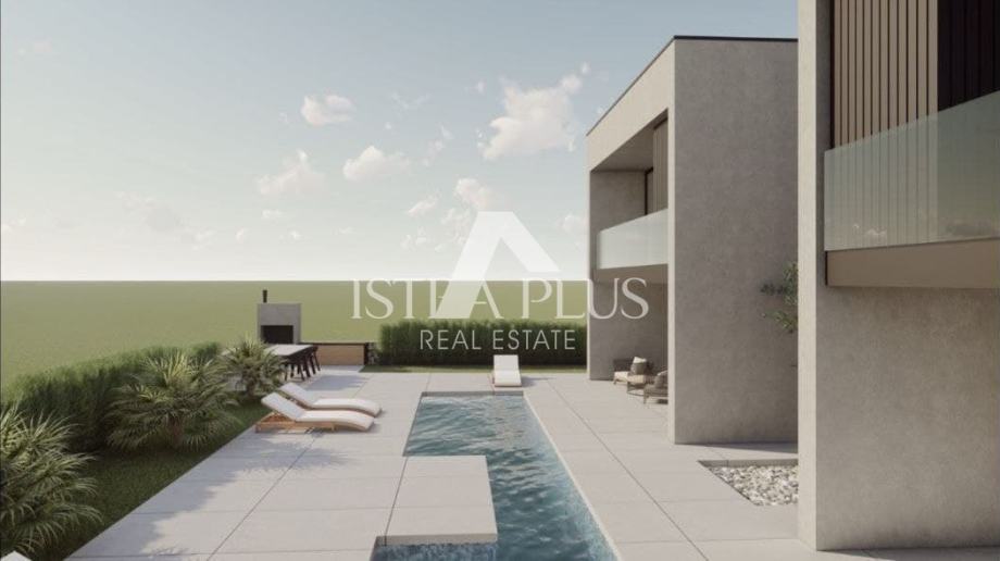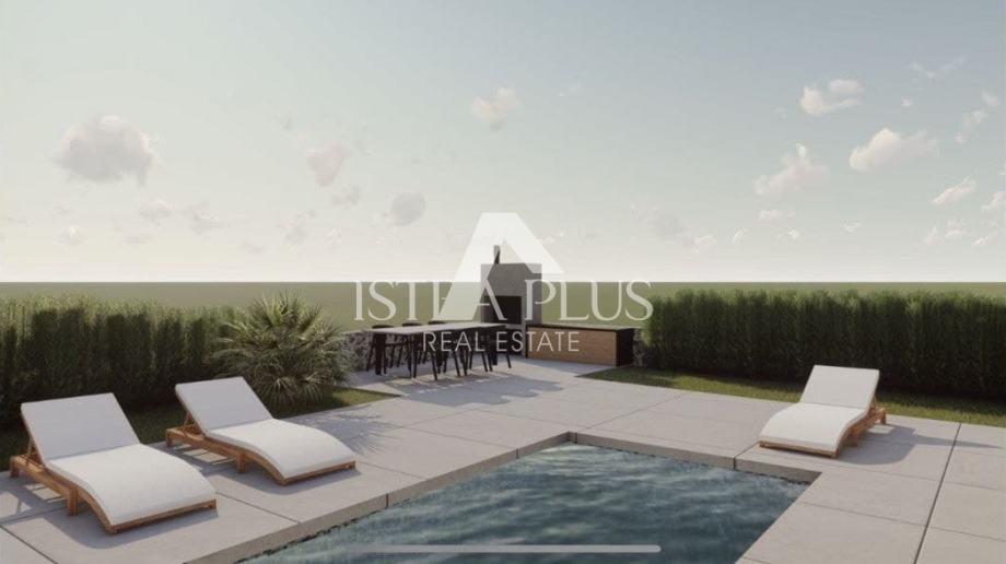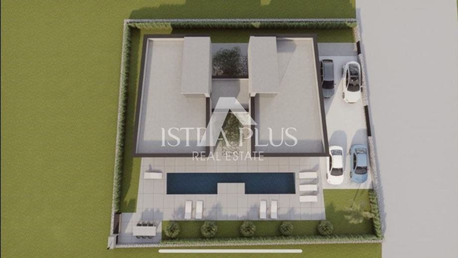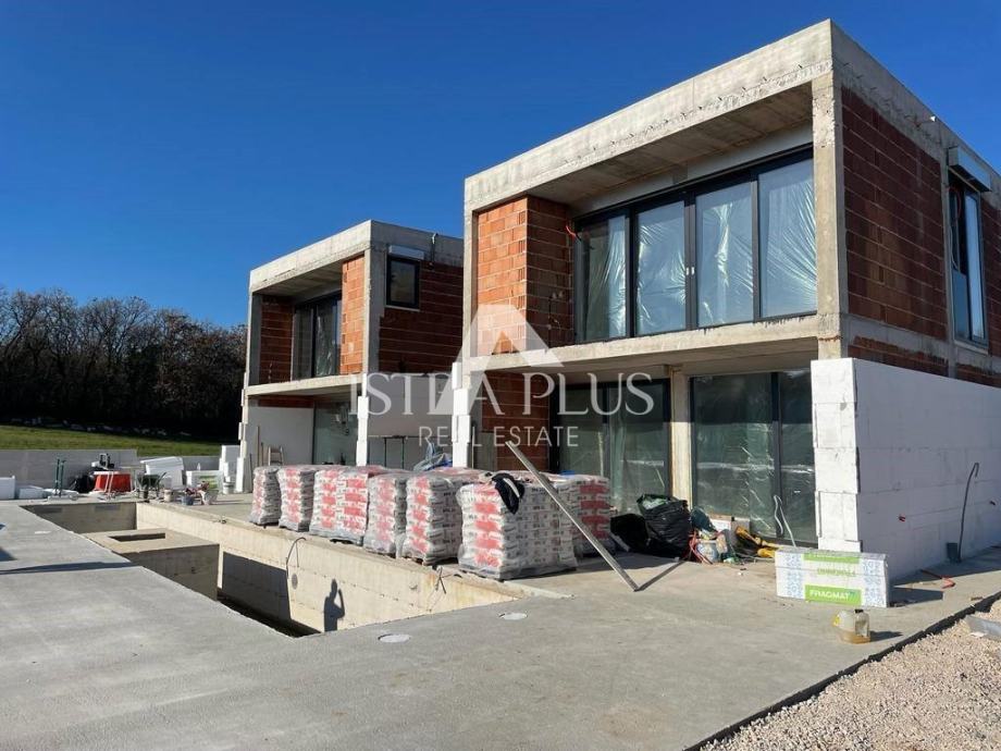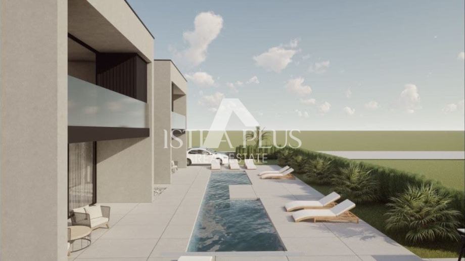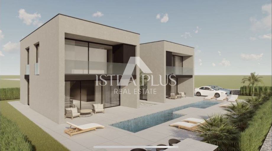 U atraktivnom naselju samo 2km udaljenog od Poreča prodaje se moderna kuća,dvojnica sa bazenom podijeljena na dvije jedinice.