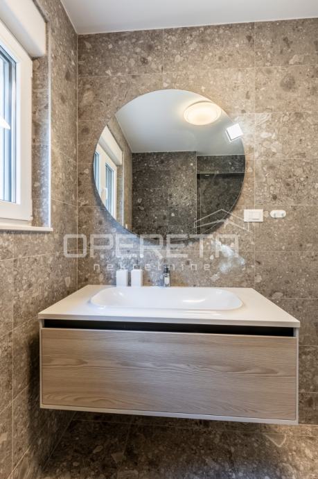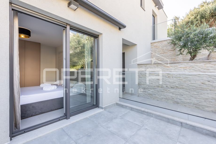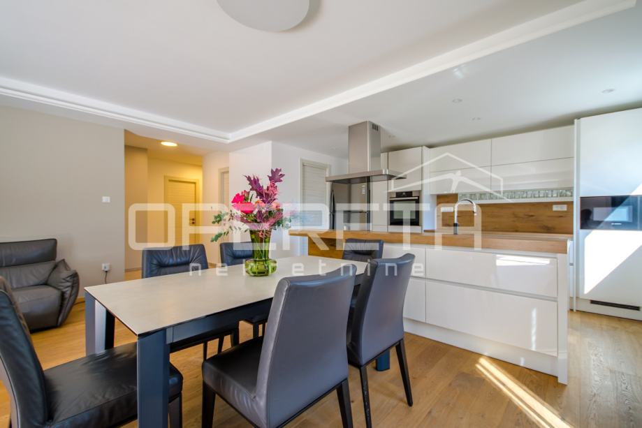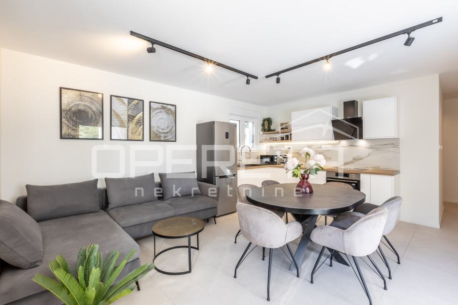 Stan u prizemlju od 95 m² nudi tri spavaće sobe, dvije luksuzne kupaonice, kuhinju s blagovaonicom i veliki dnevni boravak koji se otvara prema terasi.
