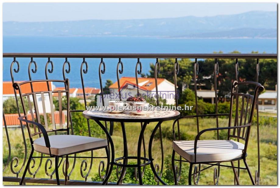 Kuća ima samo dva apartmana, moderno opremljena, s lijepim vrtom i pogledom na more i kaminom. Apartman ima veliki, moderno uređeni i koloritni dnevni boravak s kuhinjom i blagovaonicom te balkonom s kojeg možete uživati u pogledu na otok Hvar. Prostor je prostran i pun svjetla.