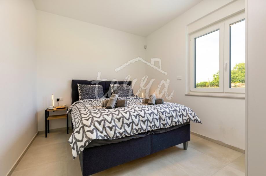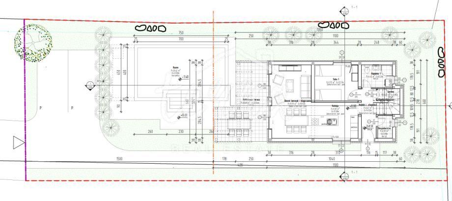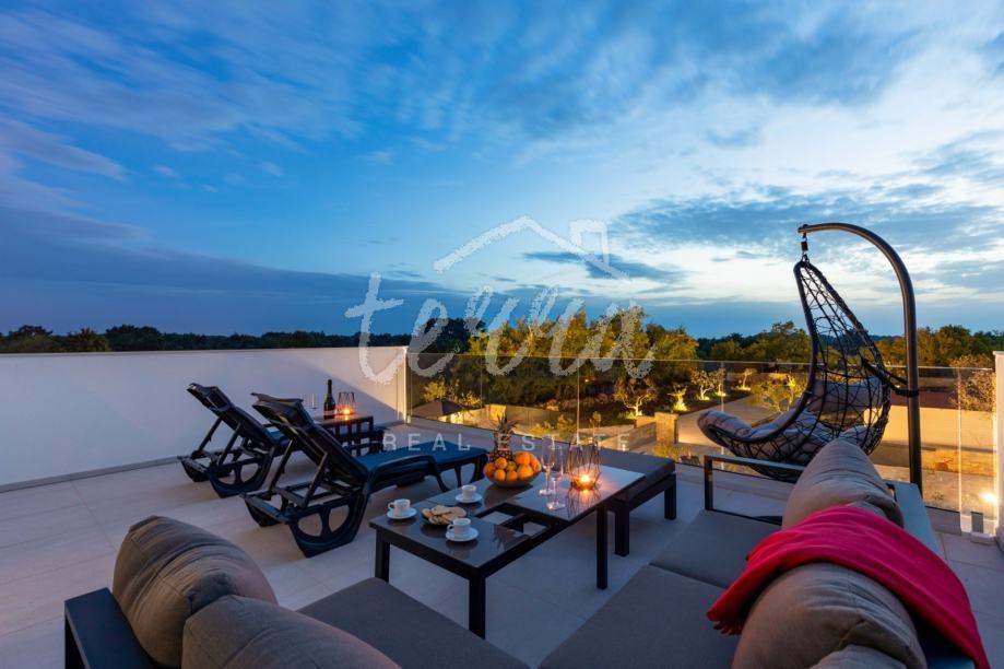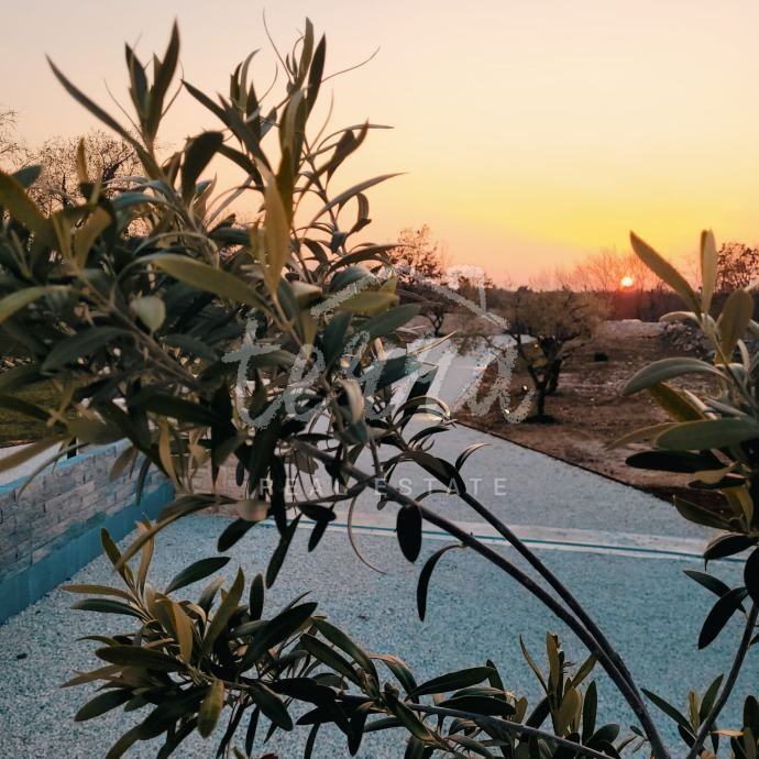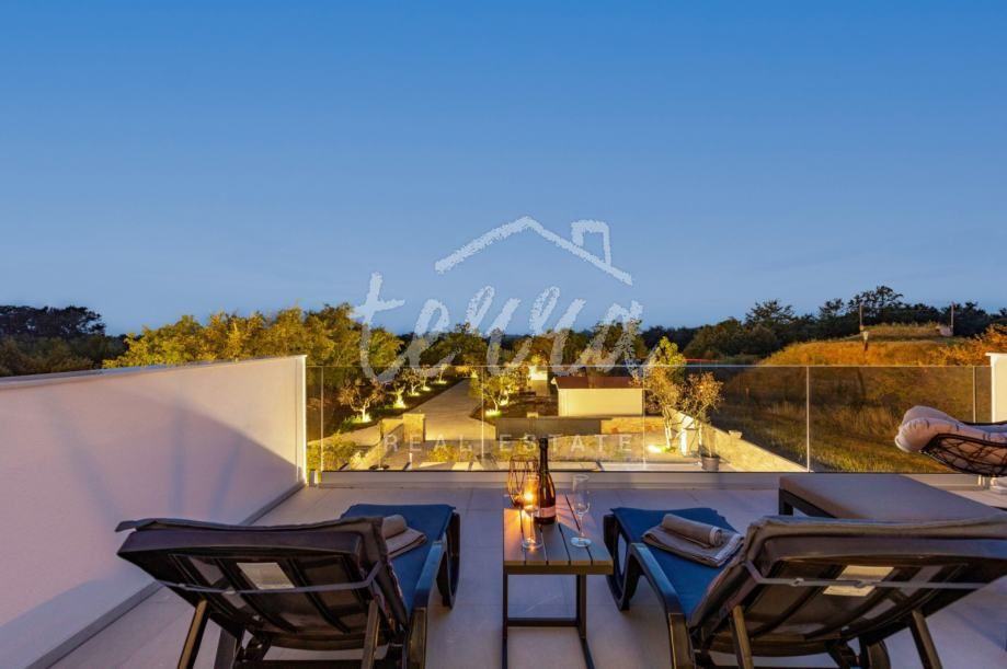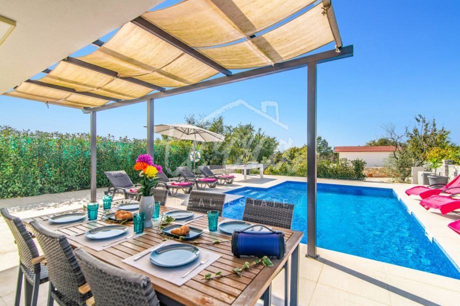 S obzirom da se radi o novogradnji, kuća je u odličnom stanju te redovito održavana. Vila je neto površine 130 kvadrata, gornja terasa ima 32, a donja natkrivena 20 kvadrata na koju se nastavlja sunčalište s bazenom od 30 kvadrata. Kuća je položena na parceli od 890 m2, okružena živicom te maslinama. Dvorište je osvijetljeno te ima ugrađeni sustav navodnjavanja.