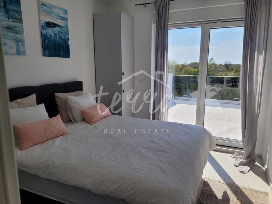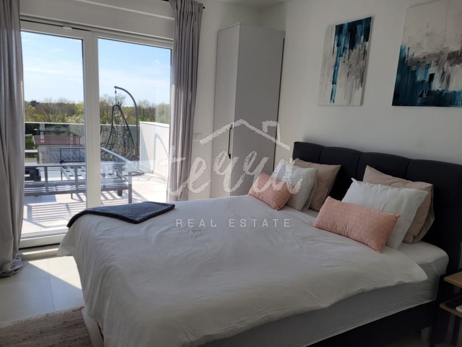 Prva etaža sastoji se od ulaznog prostora, open space kuhinje s otokom i prostorom za blagovanje te dnevnog boravka, spavaće sobe, kupaonice, spremišta, tehničkog prostora. Druga etaža sastoji se od ulaznog prostora, dvije spavaće sobe, svaka sa zasebnom kupaonicom i izlazom na prostranu terasu.