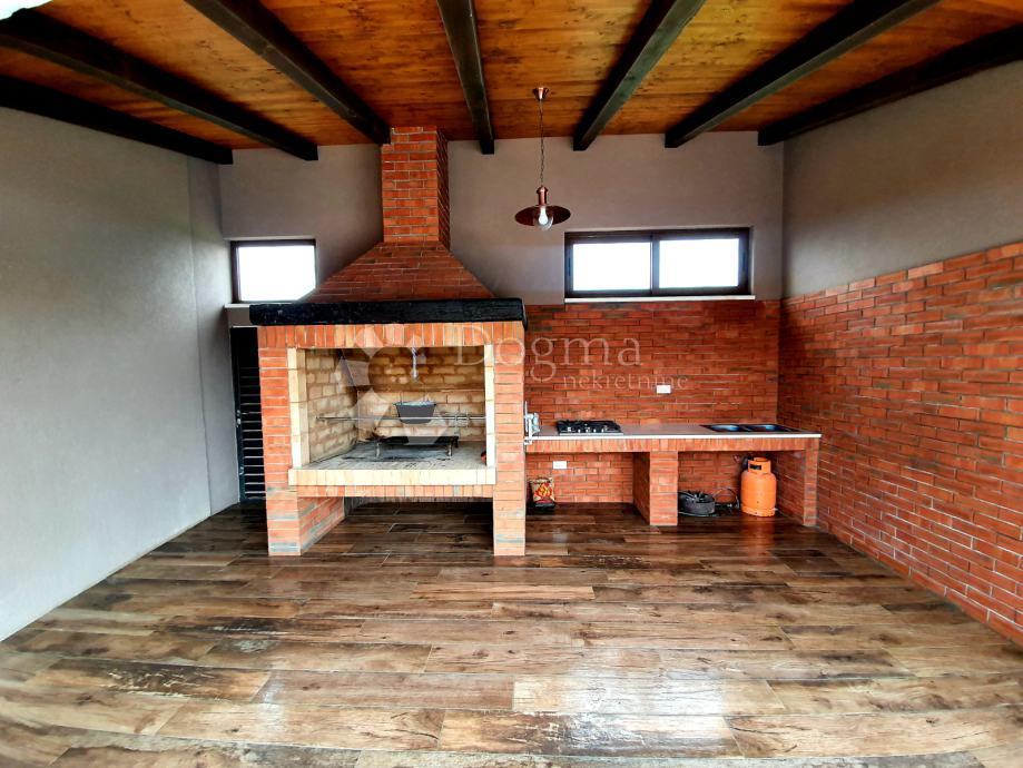 -Vanjska sjenica sa masivnim stolom i klupama, roštilj vlastita plinska ploča