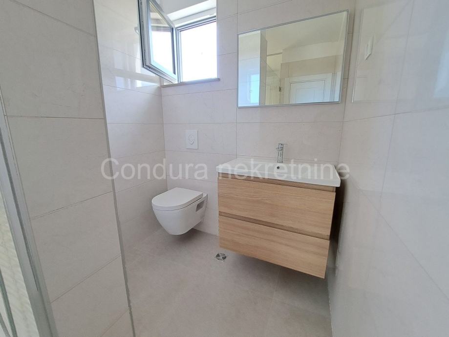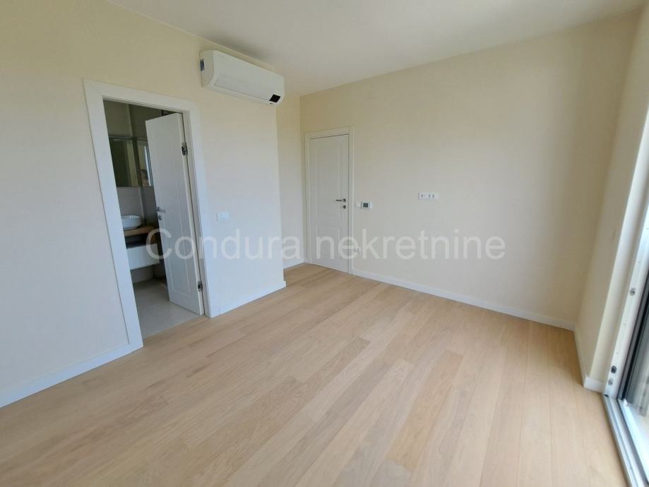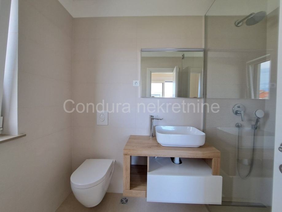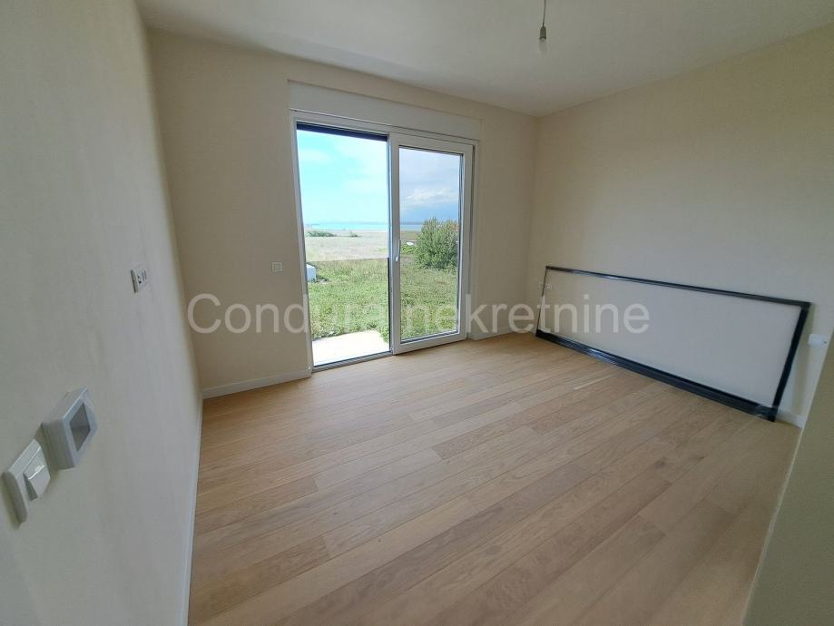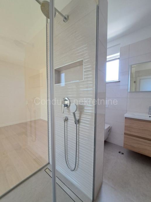 U prizemlju je smještena kuhinja, prostrani dnevni boravak s kuhinjom i blagovaonicom, dvije spavaće sobe sa vlastitom kupaonicom.
