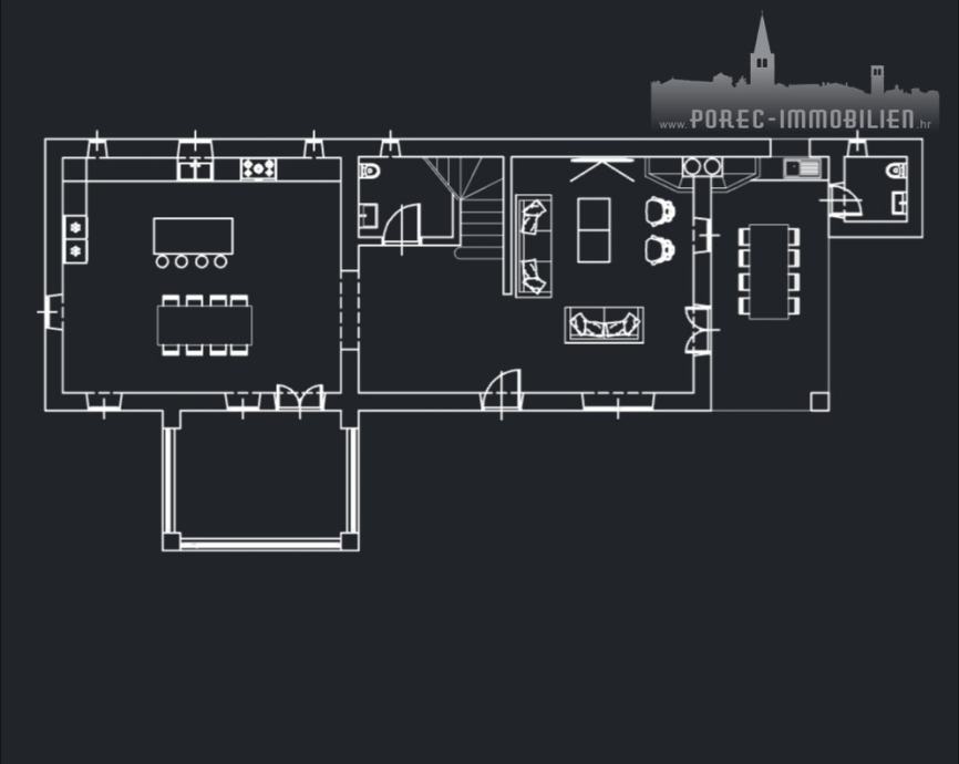 U prizemlju kuće nalazi se dnevni boravak sa kaminom i izlazom na prostranu natkrivenu terasu gdje se nalazi stol za objedovanje, kamin za roštiljanje i lounge zona, velika i potpuno opremljena kuhinja sa blagovaonicom, zasebni toalet u dnevnom dijelu i još jedan toalet u vanjskom dijelu kuće.