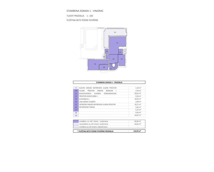 Unutarnjim stubištem dolazi se u prizemlje, gdje se nalazi ulazni prostor koji vodi u prostrani dnevni boravak. Dnevni boravak ima izlaz na natkrivenu terasu i spektakularni infinity bazen, savršeno uklopljen u vizuru s pogledom na more. U istom dijelu prizemlja smještena je kuhinja s blagovaonicom te velika kupaonica.