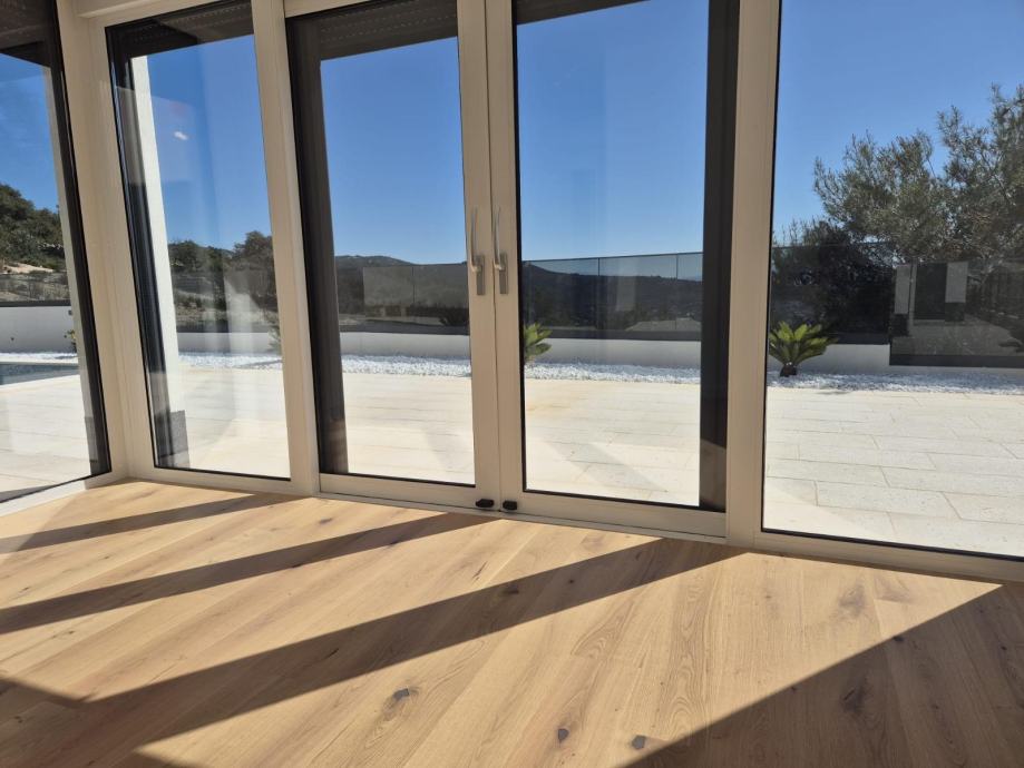 Poseban arhitektonski detalj su velika klizna staklena vrata sjeverne i južne strane dnevnog boravka, koja povezuju interijer s bazenom i natkrivenom ljetnom kuhinjom – pružajući idealnu kombinaciju sunca i hlada tijekom ljetnih mjeseci.
