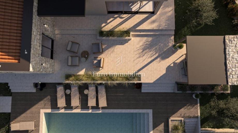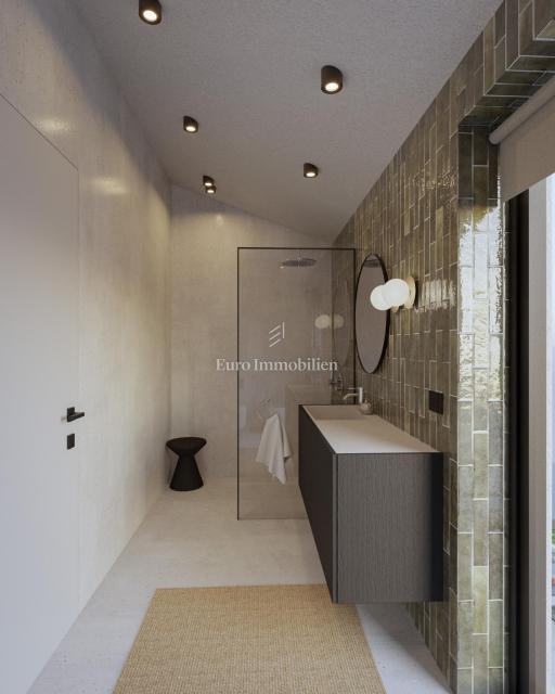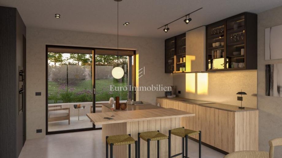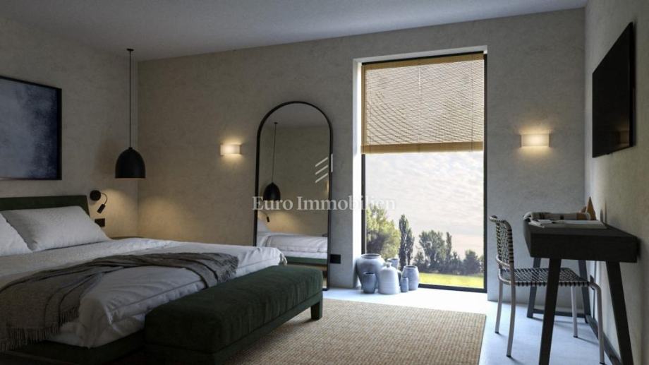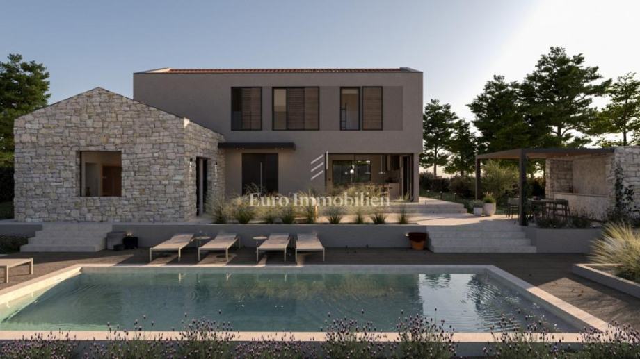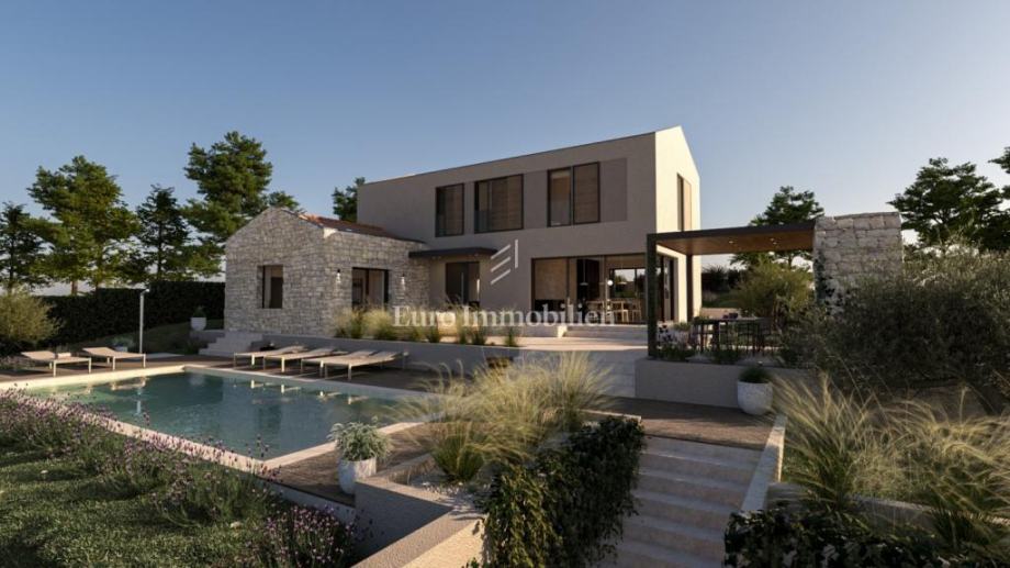 Prodaje se luksuzna villa u završnoj fazi gradnje u na mirnoj lokaciji u okolici Vrsara. Do Vrsara je udaljena cca.10 km od Vrsara, a od Poreča cca.15 km. Površina ville je 180 m2, a nalazi na zemljištu od 938 m2. Proteže se na dvije etaže, prizemlje i kat. Na prizemlju se nalaze dnevni prostor open space koncepta, sanitarije, garderoba, te tehničke prostorije za sistem centralnog grijanja i praonica rublja sa svim potrebnim priključcima, te prostorije za skladištenje osobnih stvari, bicikla i mobilne opreme za okućnicu i bazen. Dio prizemlja je uređen kao wellness prostor sa saunom i tušem. Na katu su smještene tri spavaće sobe s kupaonicom. Na ograđenoj okućnici oplemenjenoj stablima maslina, autohtonim cvijećem i travnjakom s navodnjavanjem nalazi se bazen sa sustavom za grijanje veličine 40 m2 sa sunčalištem, te kamin s natkrivenim blagovaonskim prostorom gdje se smjestila i ljetna kuhinja. Parking za dva vozila s punjačem struje za električna vozila. Pri gradnji su korišteni vrhunski materijali i oprema kao što su fasadna izolacija od 10 i 15 cm, PVC prozori, aluminijske klizne grilje u sobama, klizne staklene stijene u prizemlju, podno grijanje na vodu s dizalicom topline Mitsubishi, sustav hlađenja, vrata filomuro, podna obloga microtopping, talijanski namještaj i rasvjeta, te vrhunska oprema u interijeru kao i u eksterijeru.