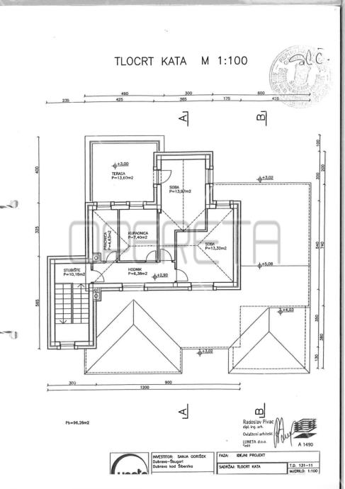 Na prvome katu su raspoređene dvije spavaće sobe, kupaonica, praonica te terasa na koju se dolazi iz jedne spavaće sobe.