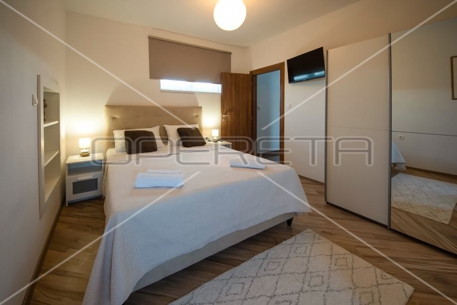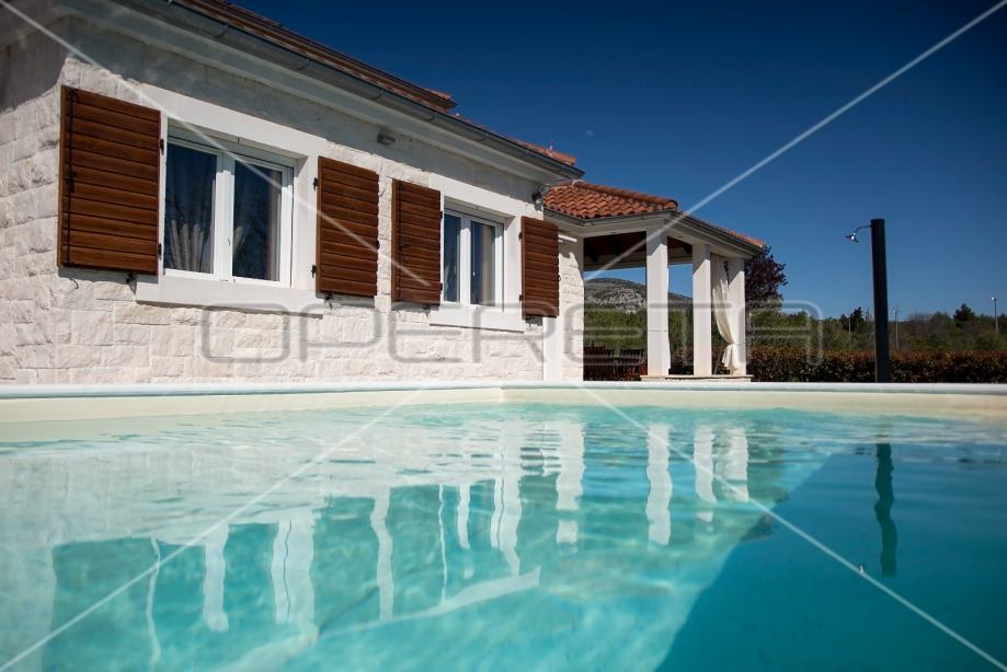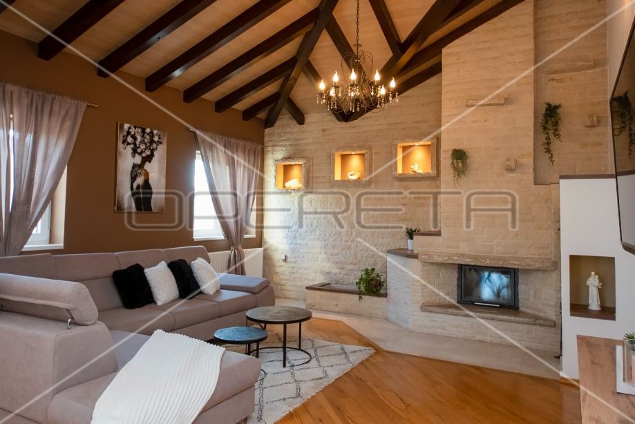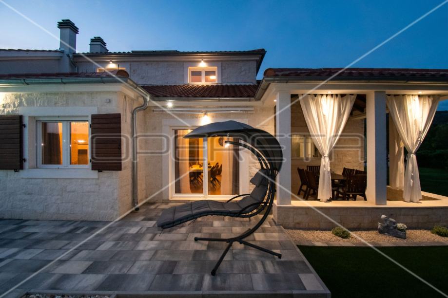 Ova nekretnina izvedena je od vrhunskih materijala. Krovne konstrukcije sazdane su od kosih te višestrešnih drvenih rogova sa pripadajućom termo i hidroizolacijom. Osim odlične izolacije koju pružaju, drvene grede krase prostor i daju mu toplinu doma. Toplinska fasada sa završnim priklesanim kamenom uklapa se u mediteransko okružje.