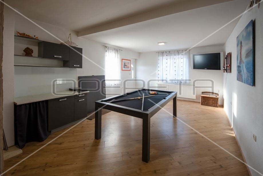 U prizemlju je smješten boravak sa dnevnom sobom, spavaća soba, kupaonica i dodatni wc, ostava te sala za zabavu. Bitno je napomenuti da se u dnevnom boravku nalazi kameni kamin, dok je u sali za zabavu unutrašnji roštilj. Kroz boravak se može izaći na trijem i uživati u pogledu na bazen od 28 m2 i zelenoj okolini.