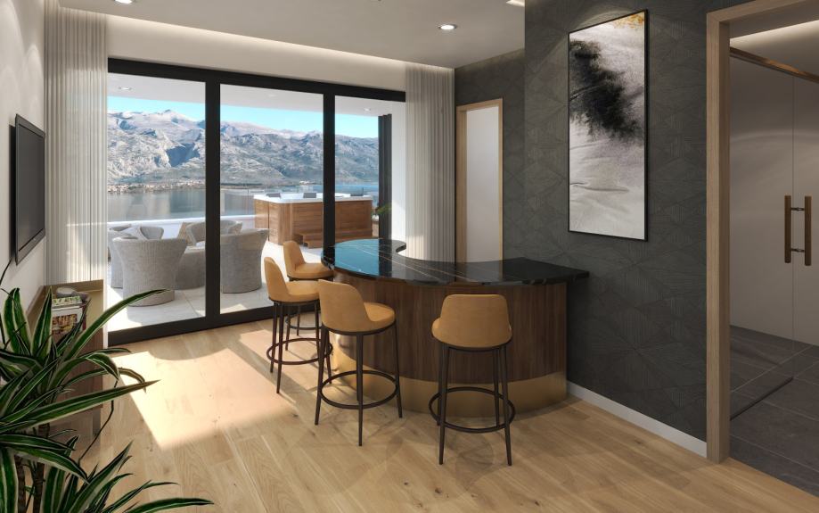 DRUGI KAT: soba s vlastitom kupaonicom, sauna s prostorom za tuširanje, izdvojeni wc, prostor za druženje, unutarnje stubište i djelomično natkrivena terasa s hidro masažnom kadom i vanjskim boravišnim prostorom.