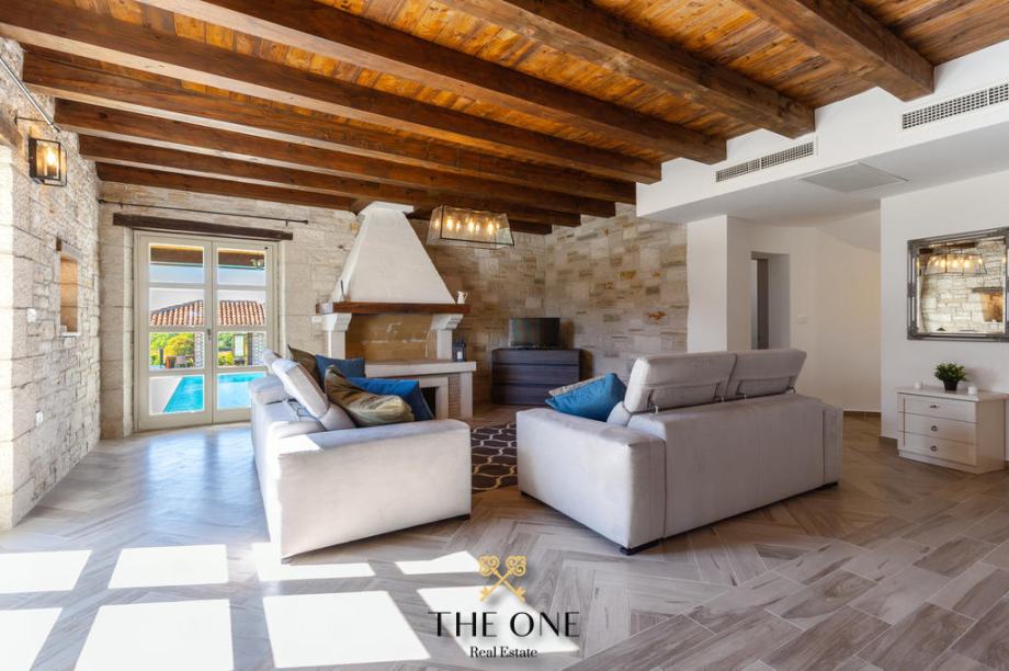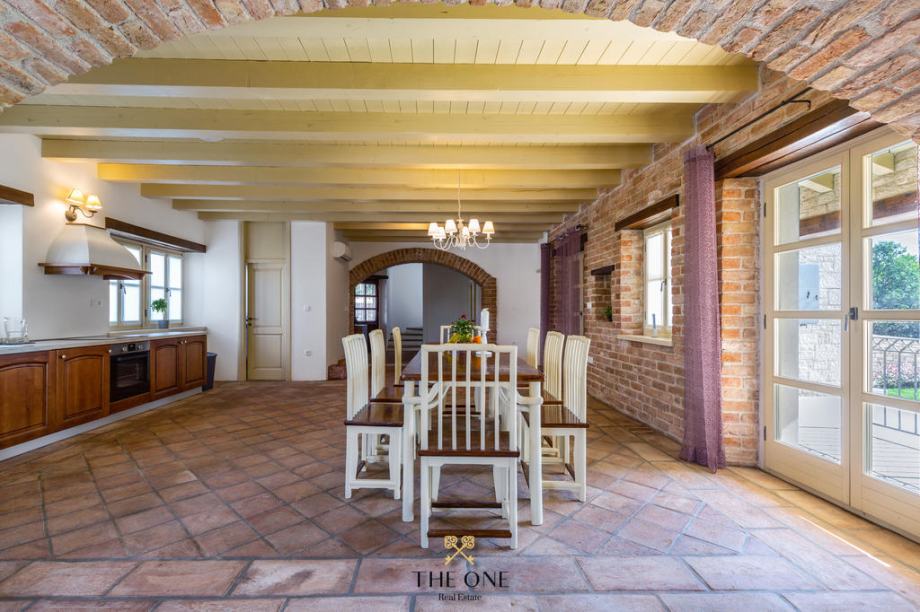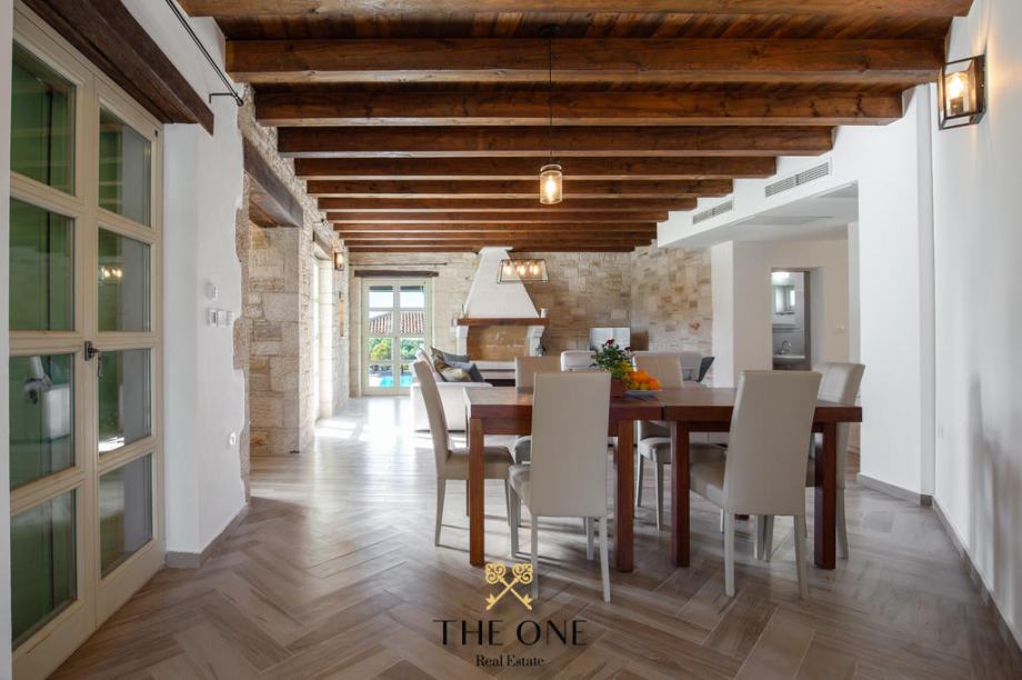U prizemlju vila je prostrani hodnik koji vodi do nevjerojatno lijepog otvorenog koncepta gdje se nalaze velike i moderno opremljena rustikalne kuhinje, blagovaonica i elegantan dnevni boravak s prekrasnim kaminom.