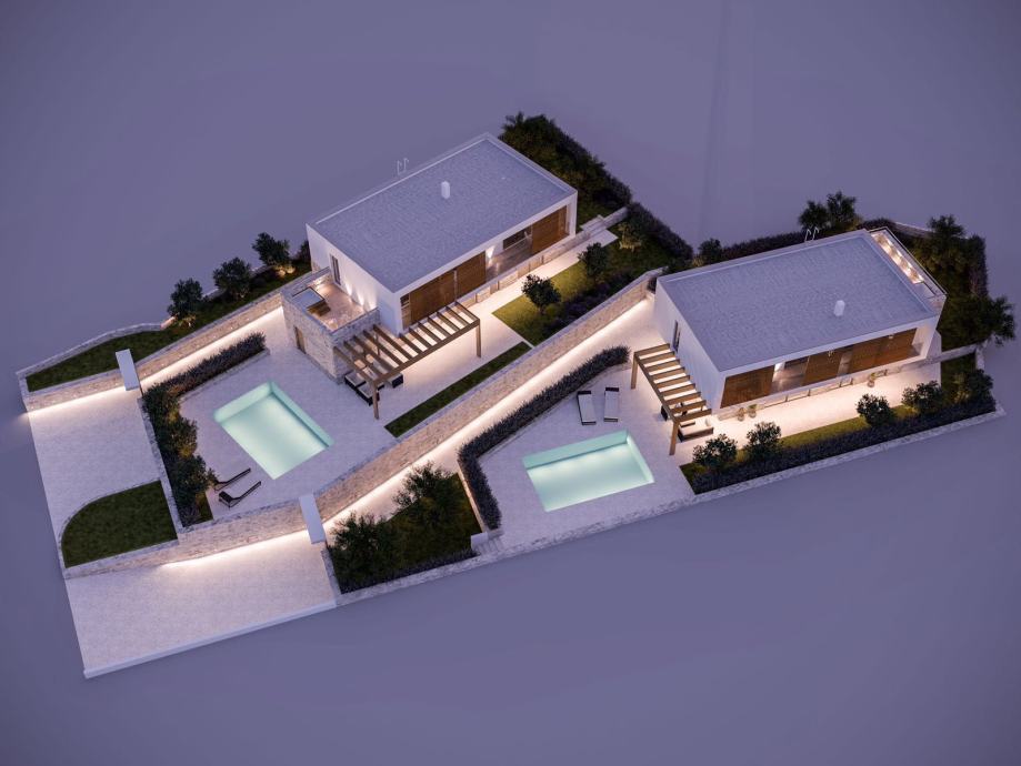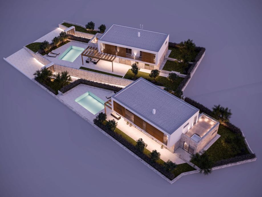 Prodaju se dvije vile sa prekrasnim panoramskim pogledom! Svaka vila sastoji se od prizemlja i kata, ima po četiri spavaće sobe, dnevni boravak, kuhinju, tri kupaonice,jedan wc. Potpuno su namještene i opremljene.Cijena od 600 000 eura odnosi se na jednu vilu.