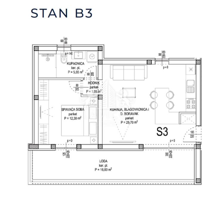 Apartman oznake B3, ukupne stambene površine 60,60 m2, sastoji se od dnevnog dijela s kuhinjom, blagovaonicom i dnevnim boravkom, jedne spavaće sobe, kupaonice s toaletom i loggie.