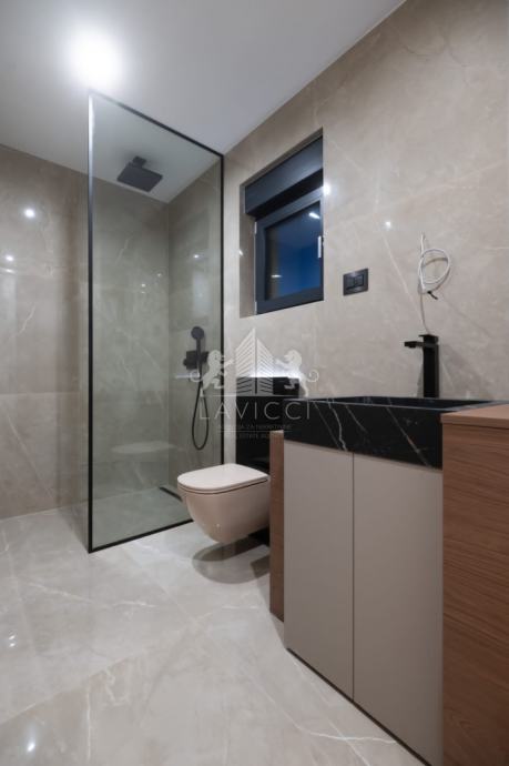 Zgrada ima ugrađeni lift marke KONE s detaljima karbona, a u cijenu je uključeno i vanjsko parkirno mjesto te ostava površine 6,15 m2. Cjelokupni objekt izveden je prema najvišim građevinskim standardima. Zgrada je građena POROTHERM blokom s STO fasadnim sustavom koji pridonosi izvrsnoj toplinskoj izolaciji, visokoj paropropusnosti i otpornosti na vlagu te je izuzetno dugotrajna i otporna na UV zrake i pucanje. Dijelovi fasade i unutarnje stubište su obloženi rimskim travertino kamenom koji stvara osjećaj autentičnosti, tišine i trajnosti. Ručna obrada svakog komada dodatno naglašava povezanost s prostorom i mediteranskom tradicijom.