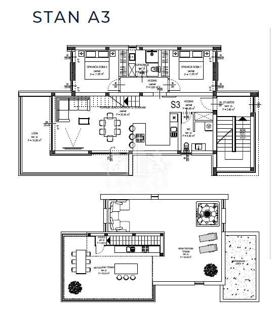 Apartman oznake A3, ukupne stambene površine 94,76 m2, sastoji se od dnevnog dijela s kuhinjom, blagovaonicom i dnevnim boravkom, dvije spavaće sobe, kupaonice s toaletom, gostinjskim toaletom s vešerajem, loggie površine 18,55 m2 i krovne terase.