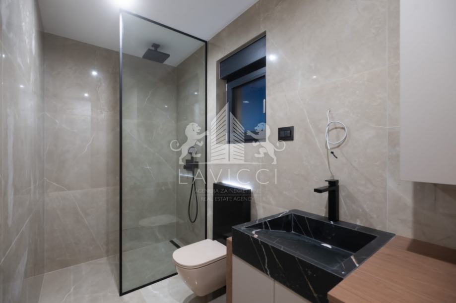 Interijer je pažljivo dizajniran kako bi pružio maksimalnu udobnost i funkcionalnost. Apartman dolazi djelomično namješten, uključujući potpuno opremljenu kuhinju s Bosch aparatima, loggiu s kazetnom tendom – spremno za useljenje ili najam bez dodatnih ulaganja. U dnevnom dijelu i spavaćoj sobi postavljen je višeslojni prvoklasni parket. Kupaonice su opremljene porculanskom keramikom velikog formata, s minimalnim fugama za čisti, luksuzan izgled. Sanitarije LAUFEN i armature HANSGROHE osiguravaju visoku razinu dizajna i funkcionalnosti, kao i monolitni vodokotlić s automatskom LED rasvjetom na senzor pokreta.