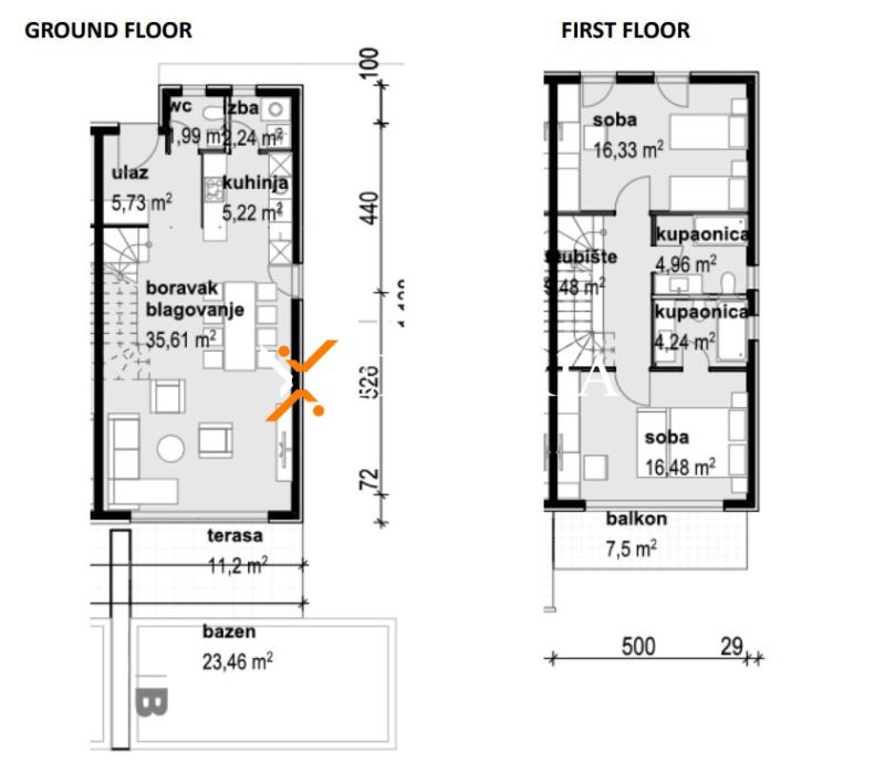 Prizemlje: ulaz, wc, kuhinja, ostava, dnevni boravak, blagovaonica, terasa