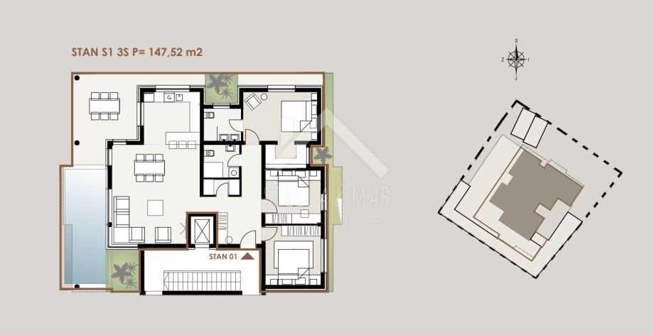 Površine je 101.17m2 i raspolaže sa prostranim dnevnim boravkom , kuhinjom, blagovaonom, tri spavaće sobe, od kojih jedna ima vlastitu kuponu i garderober, dodatnu kupaonu, spremište i prekrasnu natkrivenu terasu gdje je smješten bazen površine 16m2 u vetu površine 148m2 koji pripada apartmanu.