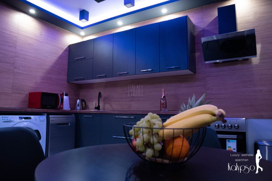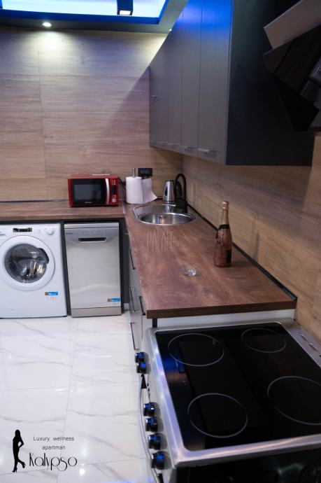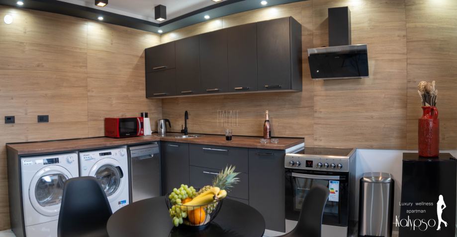 Kuhinja je rađena po mjeri te je opremljena svim potrebnima aparatima poput perilice i sušilice rublja, štednjakom, napom, perilicom posuđa te hladnjakom.