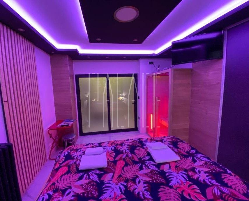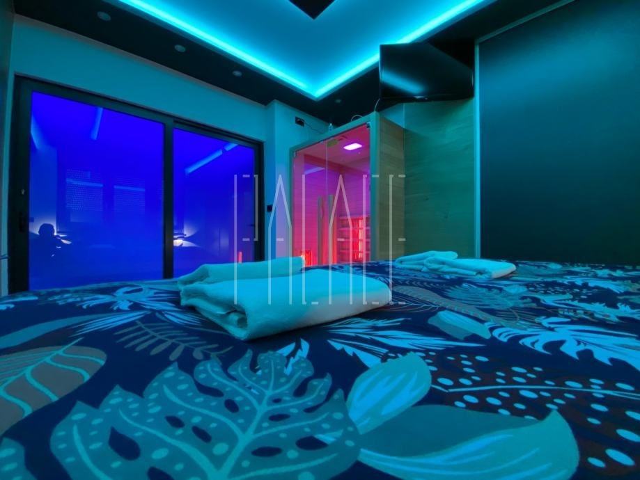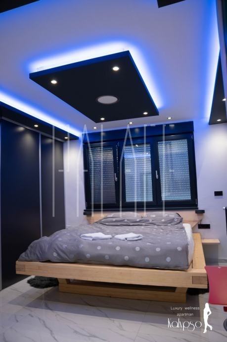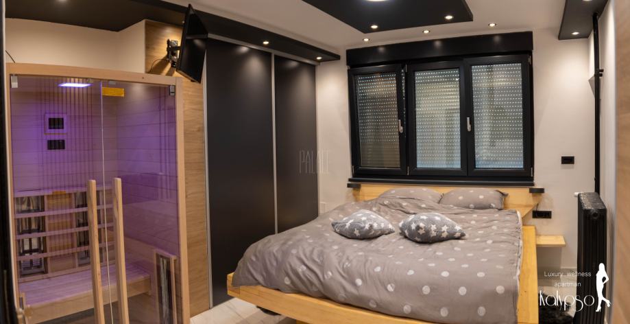 U spavaćoj sobi se nalazi infracrvena sauna, masivni veliki bračni krevet ručno rađen od punog drveta te ambijentalna led rasvjeta sa Wi-Fi upravljanjem koja je postavljena po cijelom apartmanu.
