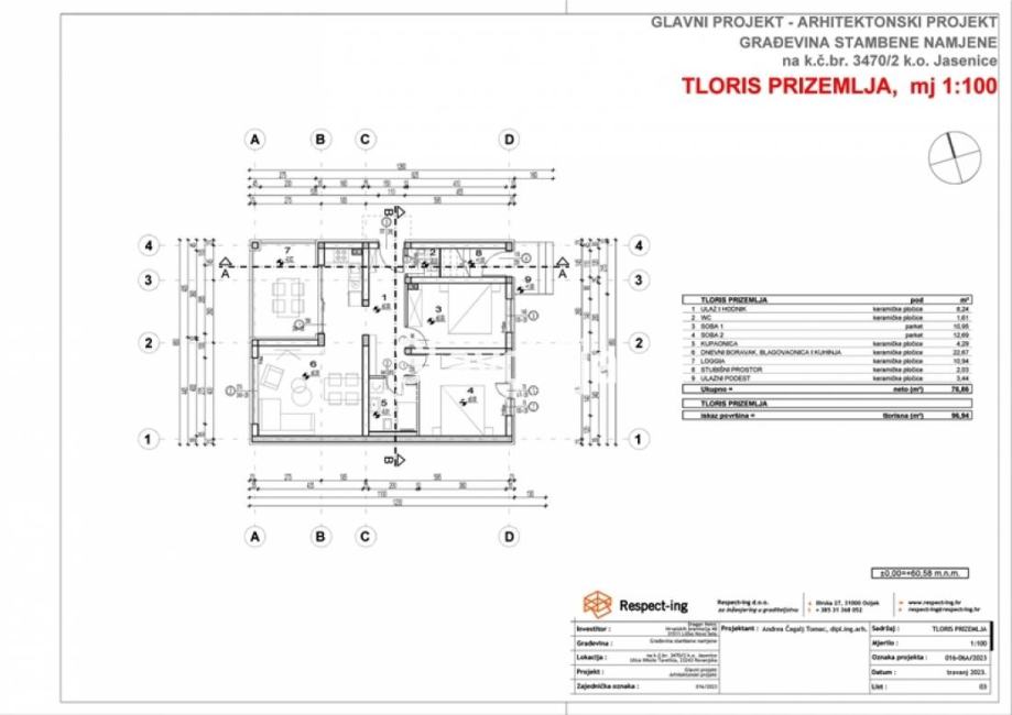 Apartman je smješten u prizemlju objekta. Objekt ima 2 stambene jedinice u formi prizemlja i 1. kata. Nalazi se na građevnoj čestici veličine 381 m2. Građevina je projektirana kao poluugrađena, jednostavnog i pravilnog tlocrtnog oblika, maksimalnih dimenzija 12,30 m x 8,50 m.
