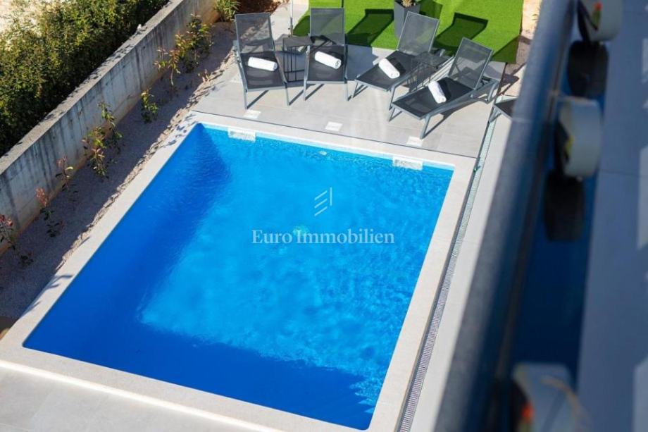 Prodaje se apartman površine 91,03 m2. Apartman je dvoetažni i sastoji se od kuhinje s blagovaonom i dnevnim boravkom, tri spavaće sobe, tri kupaonice, dvije natkrivene terase. Ispred apartmana je prostrana okućnica s bazenom. Pripada mu jedno parkirno mjesto.