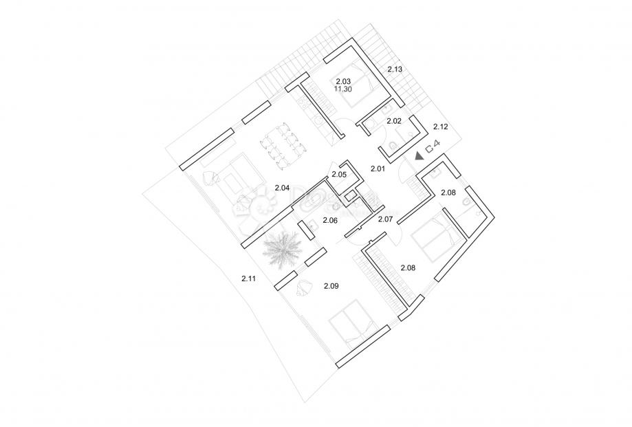 Apartman je neto površine 117 m² i sastoji se od: ulaza sa hodnikom (4 m²), WC sa tušem, tri spavaće sobe (23,4 m², 14,9 m², 11,3 m²), dvije kupaonice (4,8 m² i 7,6 m²), garderobe (1,5 m²), terase (26,9 m²) i dnevnog boravaka sa kuhinjom (34,8 m²).