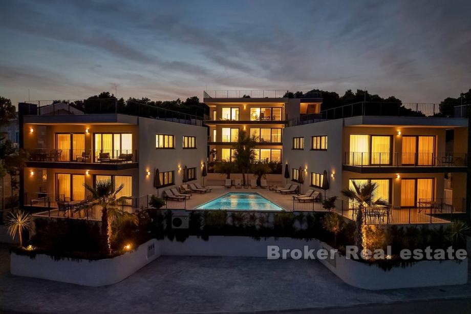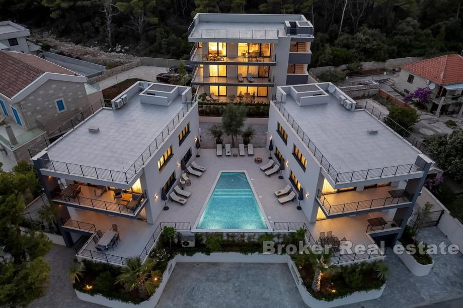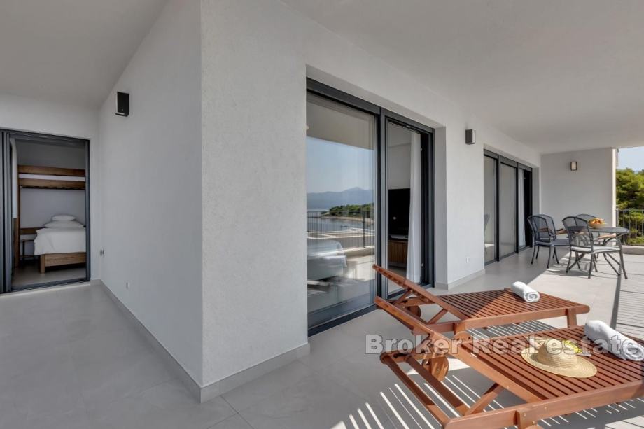 U prodaju se nudi moderni, ekskluzivni apartman u prizemlju koji se nalazi u prvom redu do mora i ima pogled na kristalno more. Nalazi se u blizini mjesta Sućuraj na otoku Hvaru. Pozicioniran je na južnoj strani te odiše najvišom udobnošću, modernim talijanskim interijerom i elegantnim dizajnom. Nudi idealan moderan ambijent uz jedinstven pogled na mediteransku obalu. Uz puno pozornosti u talijanskim detaljima interijera i eksterijera, moderne tehničke opreme, najnovijih građevinskih materijala s čarobnim dodirom glamura, ovaj apartman pruža luksuzni odmor za svaku obitelj. Stambena zgrada izgrađena je na tri etaže te u njoj nitko stalno ne stanuje, nego je vlasnik koristi za sezonski i izvansezonski odmor.