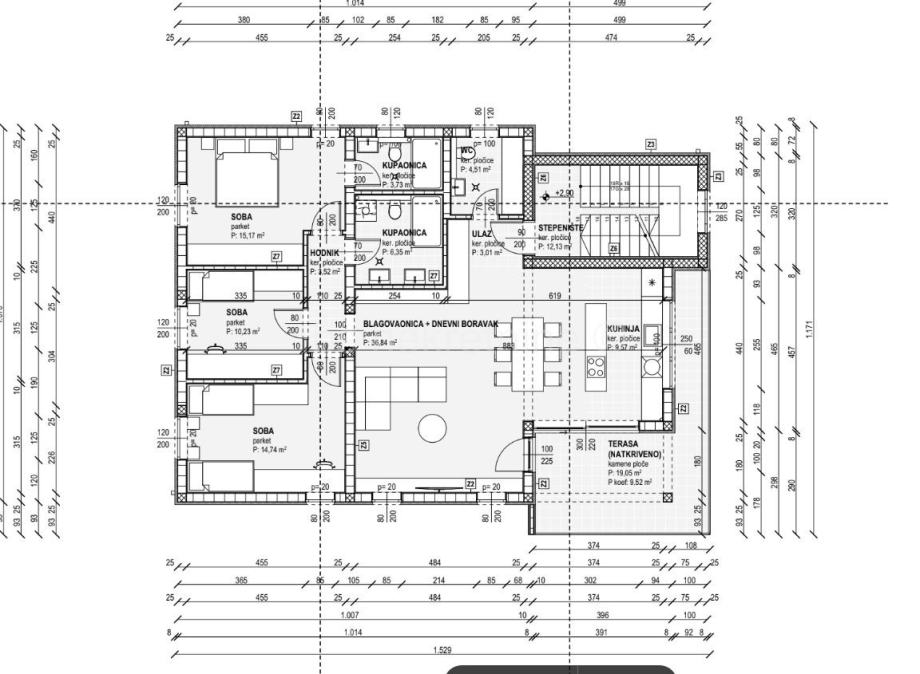 Trosoban apartman površine 120 m2 s kuhinjom, blagovaonicom, dnevnim boravkom i dvije kupaonice nalazi se u prizemlju objekta.