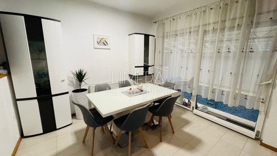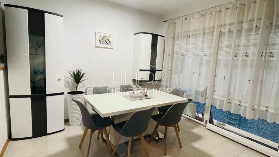 Stan se prostire na jednoj etaži i uključuje četiri prostrane sobe, dvije kupaonice s WC-om, te prostranu kuhinju koja je povezena s blagovaonicom i dnevnim boravkom. Za ljubitelje ugodnog opuštanja, stan nudi neposredan pristup terasi i bazenu smještenim u zelenom okruženju, što pruža privatnost i mir. Posebno je atraktivan jer izlaz na bazen imate izravno iz blagovaonice.