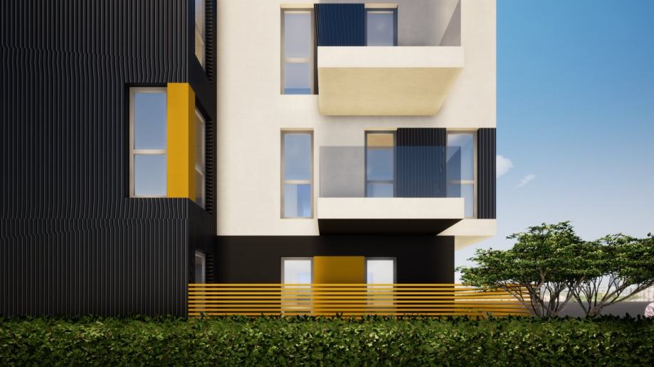 Arhitektonski koncept zgrade omogućio je kvalitetnu orijentaciju svih stanova s obzirom na osunčanje i vizure, a svi vanjski otvori (prozori i sl.) su 5 komorna PVC stijene s roletnama na struju kvalitetne marke ostakljene troslojnim izolirajućim staklom punjenim plinom. Pročelja zgrade su kvalitetno termoizolirana 15cm, što rezultira minimalnom potrošnjom energije.