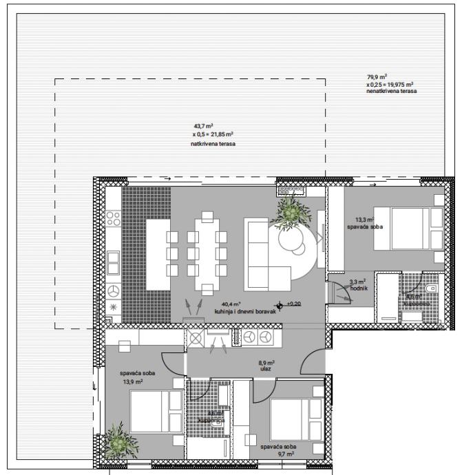 - open space kuhinje, blagovaonice i dnevnog boravka