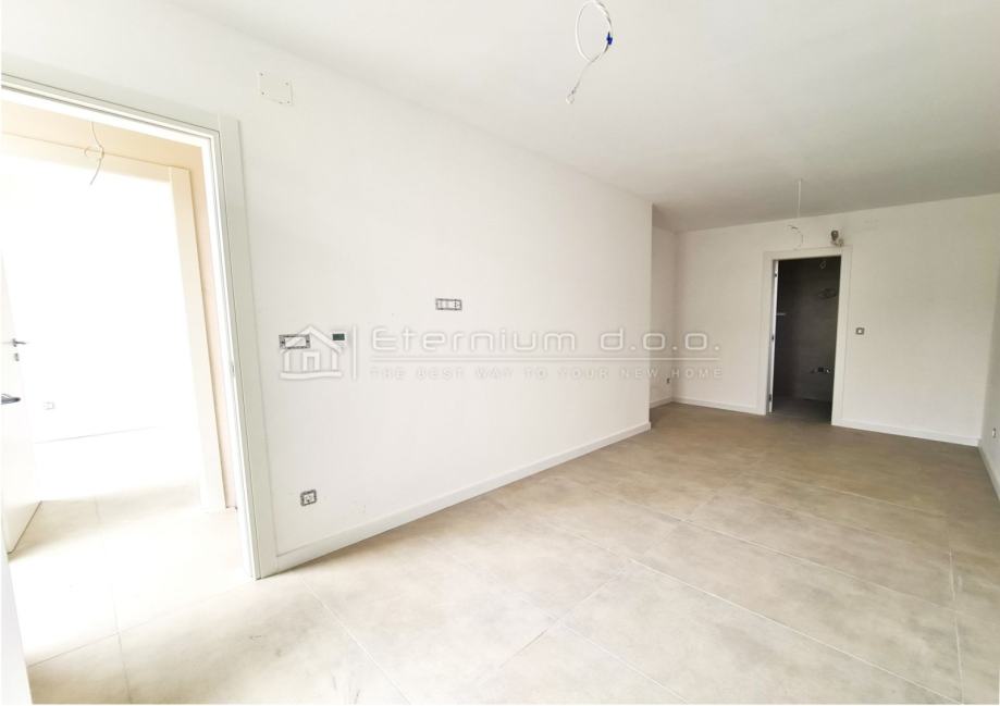 Apartman koji se ovdje prodaje je dvoetažni i proteže se kroz prvi i drugi kat. Prva etaža se sastoji od predsoblja sa stepenicama za gornju etažu, wc-a sa vešerajem, spavaće sobe sa vlastitom kupaonom te dnevnog dijela kojega čine kuhinja sa blagovaonom te prostrani dnevni boravak iz kojega se izlazi na veliku natkrivenu terasu koja se spaja sa sjevernom terasom na koju je smješten bazen. Druga etaža se sastoji od predprostora te dvije spavaće sobe - svaka sa vlastitom kupaonom te izlazom na 23m2 veliku, zajedničku, polunatkrivenu terasu. Sa obje terase se pruža predivan pogled na more i otok Krk.