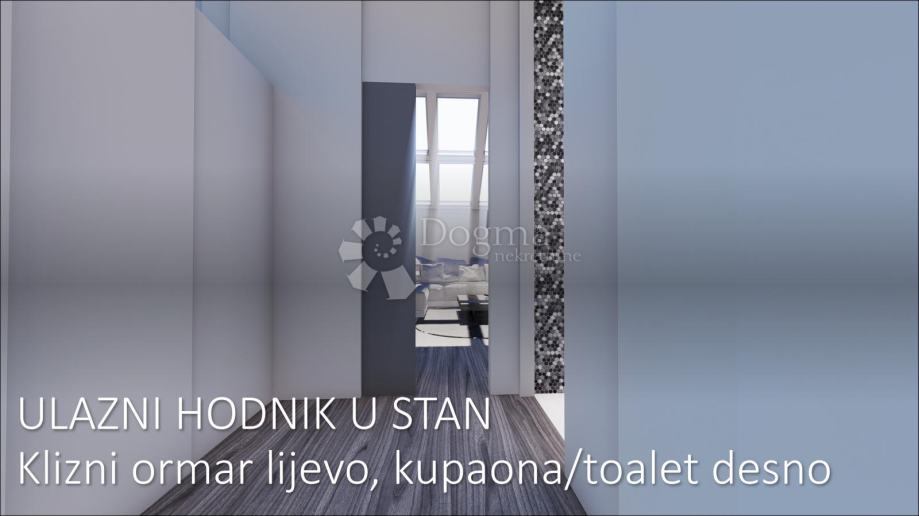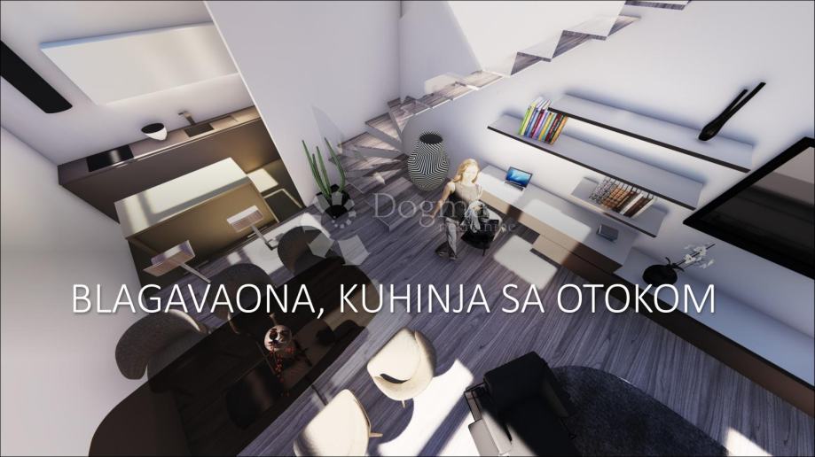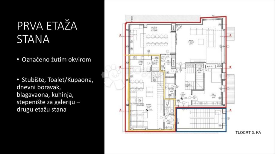 Stan se sastoji od dvije etaže; Prva etaža stana obuhvaća; dnevni boravak, kuhinja, blagovaona,toalet/kupaona, stepenište za galeriju.